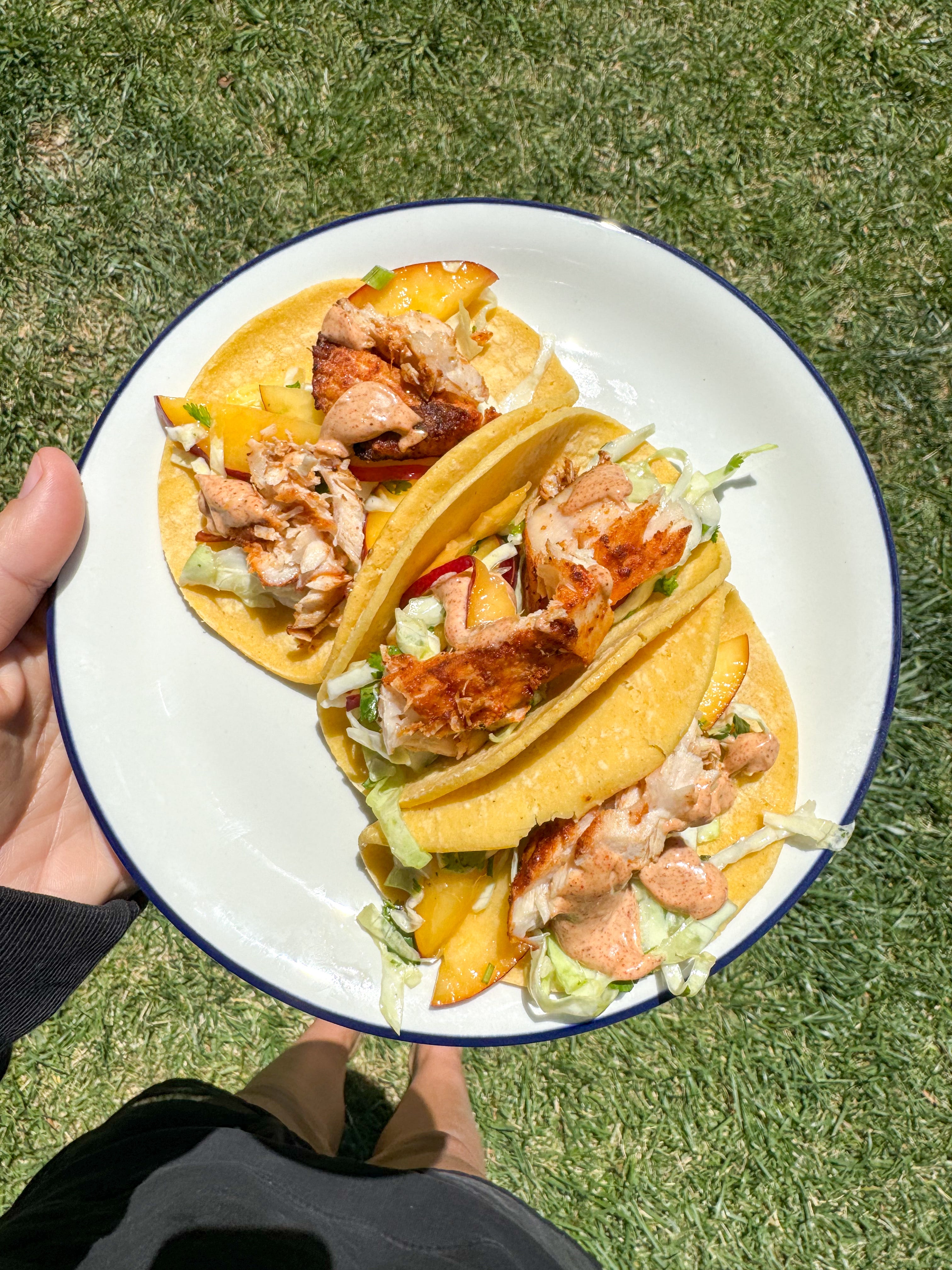 The base is flaky oven-roasted white fish (flounder, mahi mahi, cod, halibut — any firm white fish will do!) that’s been perfectly seasoned with oil, lime juice, chili powder, garlic powder, and smoked paprika. While it’s cooking, you’ll throw together an addictive peach slaw using bagged shredded cabbage (one of my favorite time-saving ingredients) and a creamy chili lime sauce. Separate, these components are delicious; wrapped together in a warm tortilla, they make the absolute perfect bite of food.