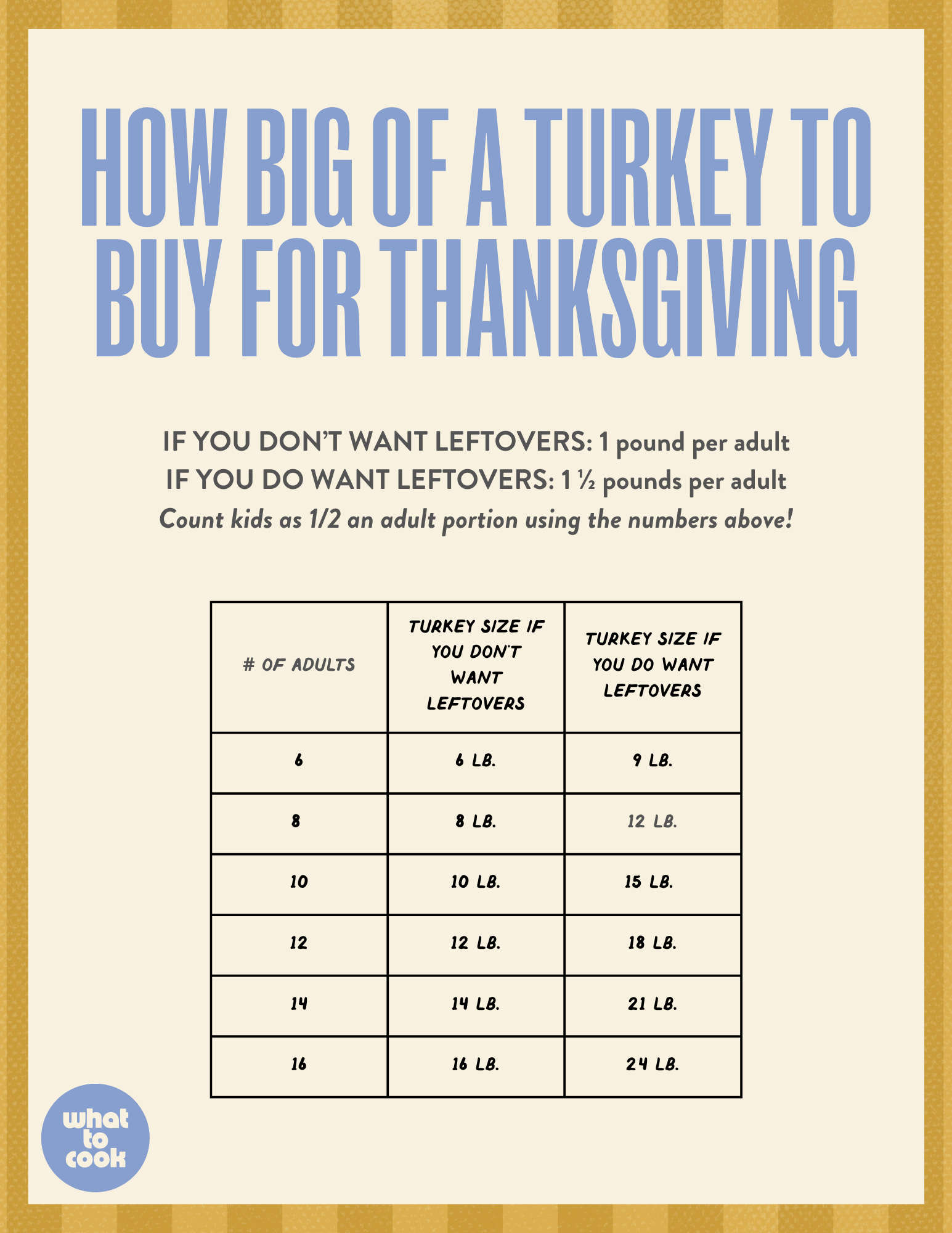 The first step in figuring out how big of a turkey to buy is this: do you want to have leftover turkey to make soups, sandwiches, and casseroles with? If you do (I always do!!), I recommend getting 1 1/2 pounds of turkey per adult and 3/4 pound per turkey-eating child. If you don’t want a lot of leftovers, I’d go with 1 pound per adult and 1/2 pound per child. I know, 1 1/2 pounds of meat sounds like a lot! But we’re accounting for the weight of the carcass, etc. Here’s a cheat sheet in case it helps. Also: You may have to buy and cook two turkeys, if your group is big enough!