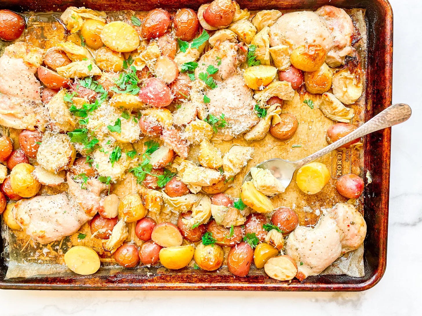 sheet-pan chicken with artichokes and potatoes (pictured just above)