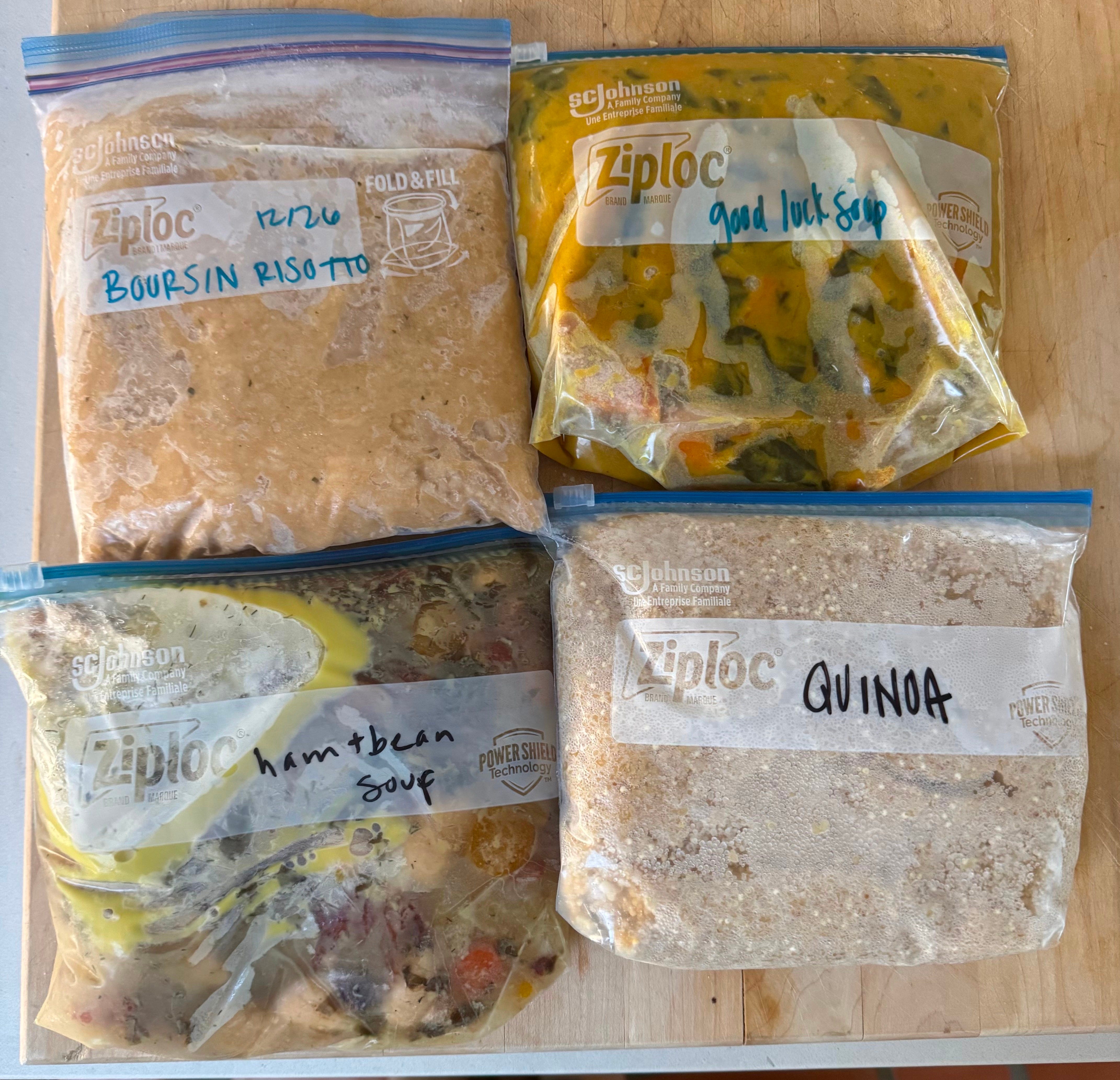 I freeze extra servings of soup, mashed potatoes, risotto, you name it in quart ziplocks, and lay them flat in the freezer (typically on a sheet pan) until solid. Then I can stack them easily in the freezer. To thaw, I run the ziplock under warm (not hot, so that the plastic isn’t heated enough to leech) water until the ziplock detaches from the food, then pull it off. I place the brick of frozen food in a skillet or wide pot, add a splash of water, cover, and cook over medium heat, stirring often, until warm.