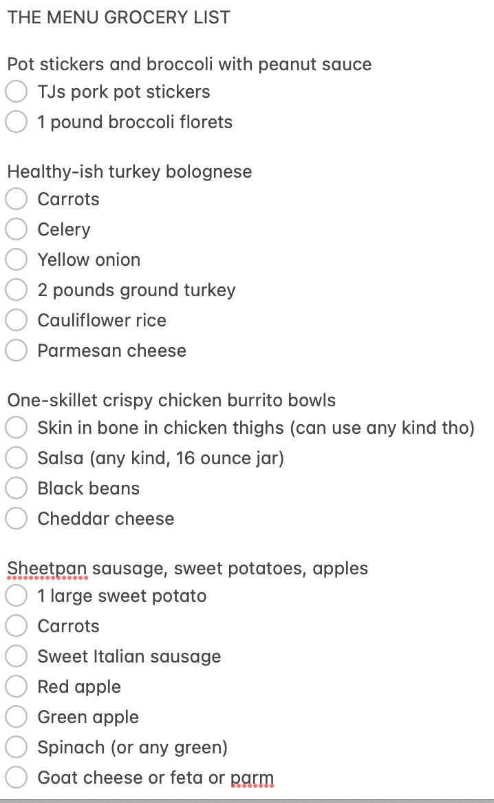 A note: there’s a time and place for using The Menu. Right now, in the crazy postpartum-with-two-toddlers-and-a-job period that I find myself in, The Menu feels absolutely genius. But if you don’t have kids, or are perhaps in a jobless period, finding new recipes to cook every week might sound really fun to you! A month from now, you might find yourself in a stressful period and come back to The Menu. Keep it as a note on your phone and use it on the weeks when you need it.