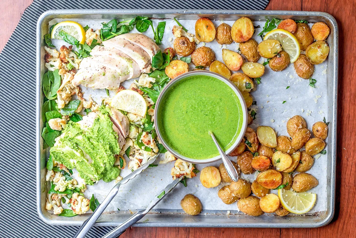 DINNER DAY #1: one-pan roasted chicken, cauliflower, and potatoes with a ridiculously tasty green sauce