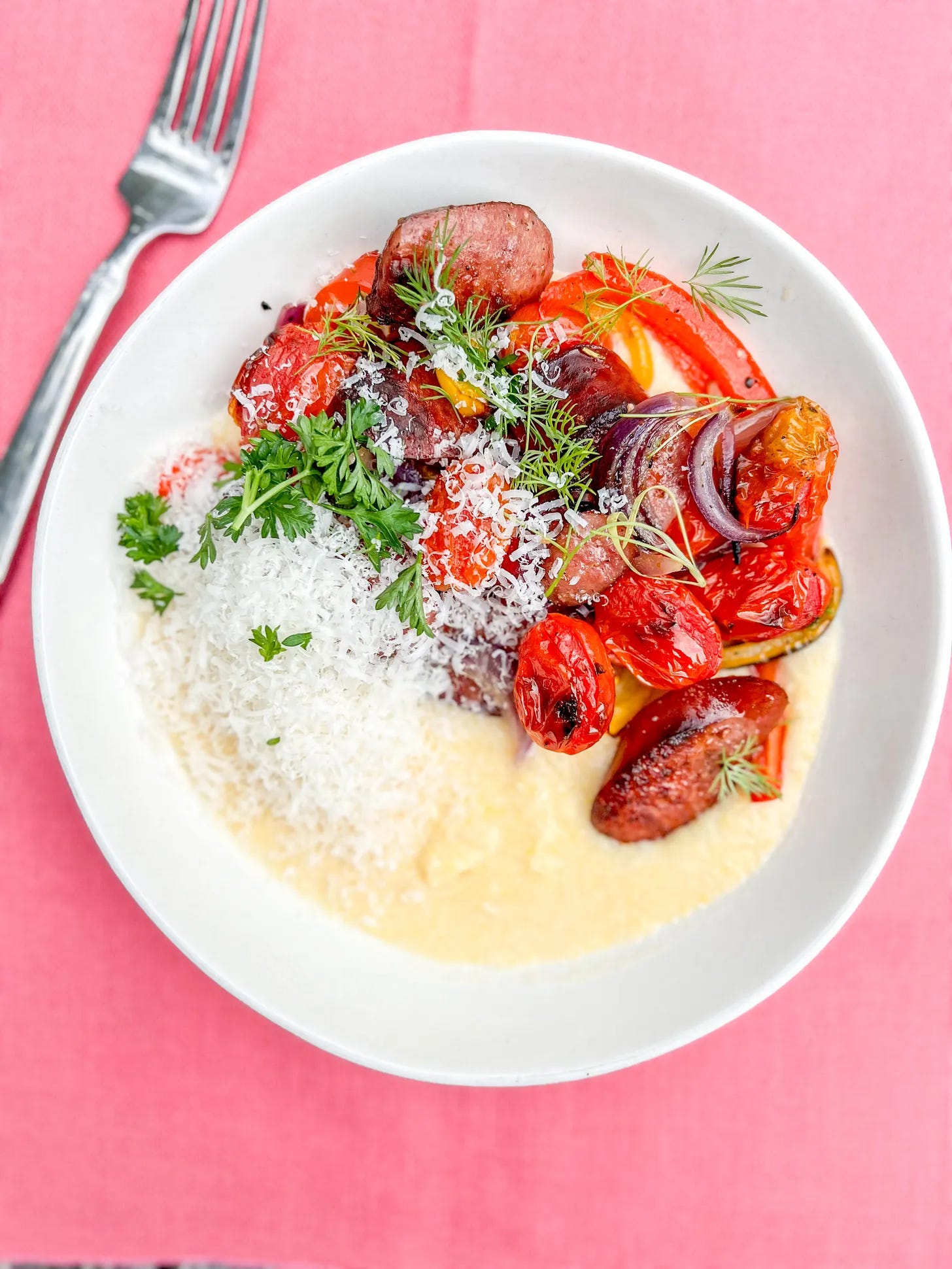 DINNER DAY #3: cheesy polenta bowls with peppers and kielbasa