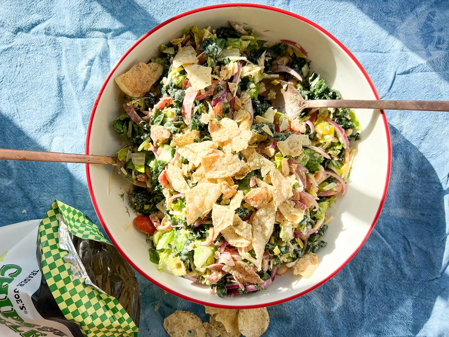 Heat up another bowl of chili or make a clean-out-the-fridge salad (or both). You can eat any mob wife salad leftovers, or just take a bed of chopped romaine (or any greens you’ve got in the fridge) and add shredded carrots, cucumbers, chickpeas, or literally any veggies and cheese you have in the fridge. Keep it simple with a store-bought dressing.