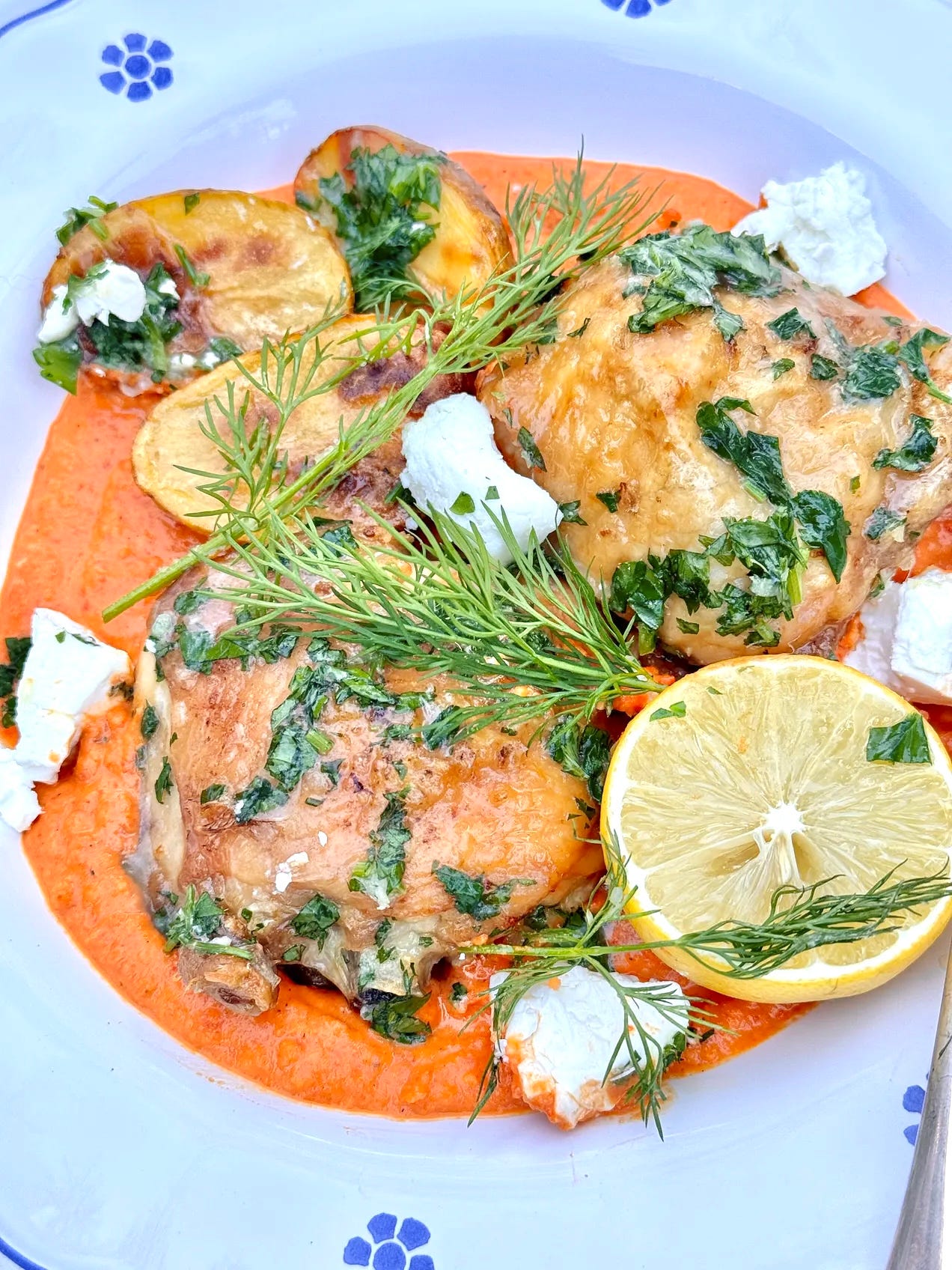 (almost) one-pan garlic butter roasted chicken and crispy potatoes with romesco, feta, and lemon