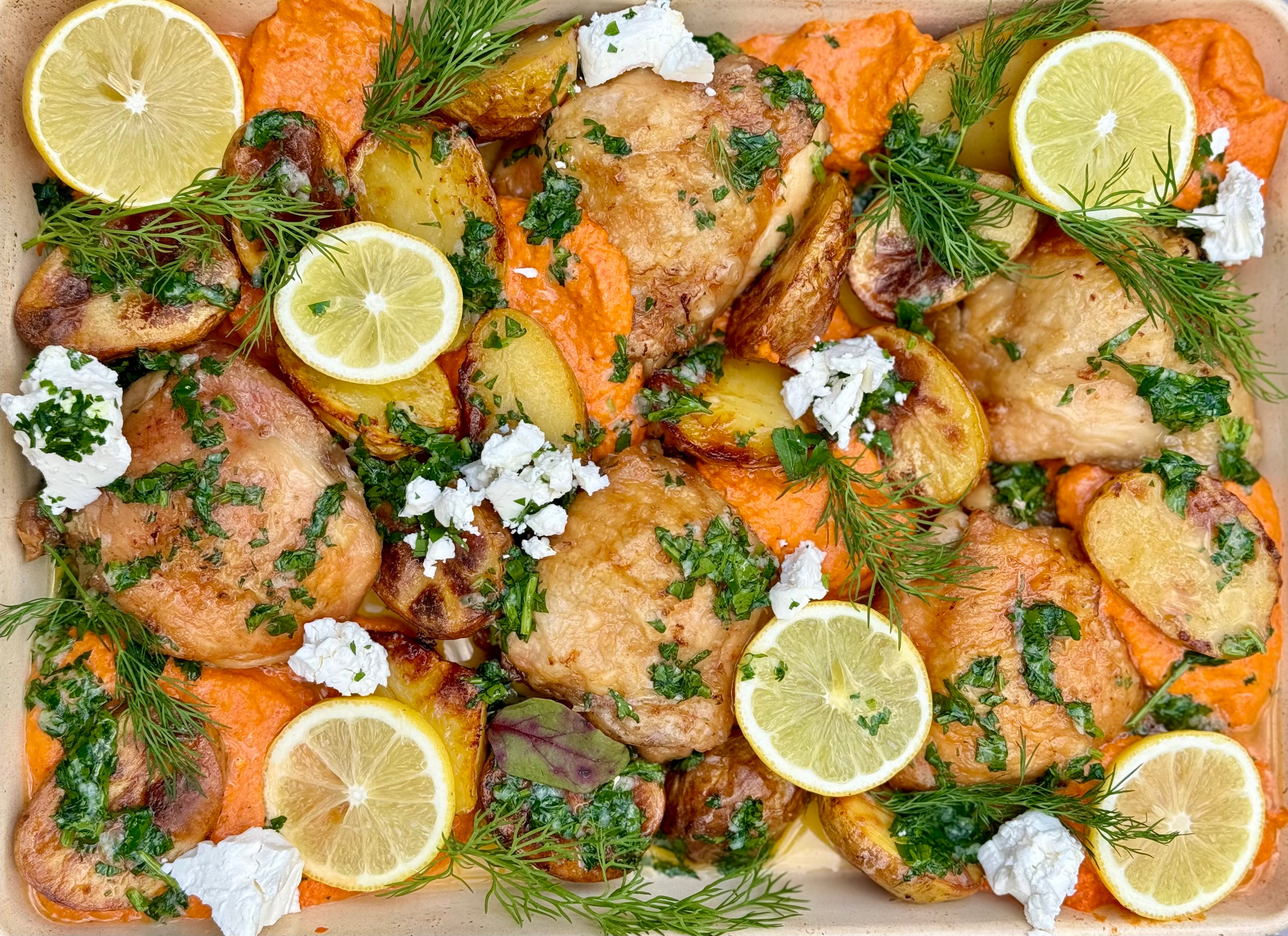 Remove the chicken and potatoes from the oven and drizzle the warm garlic butter over top. Spoon on some of the romesco sauce, add lemon slices, and crumble 1/4 cup feta over top. Add some fresh herbs for garnish and bring the whole pan to the table to serve family style alongside some good bread or pita, if you’ve got it. Enjoy!