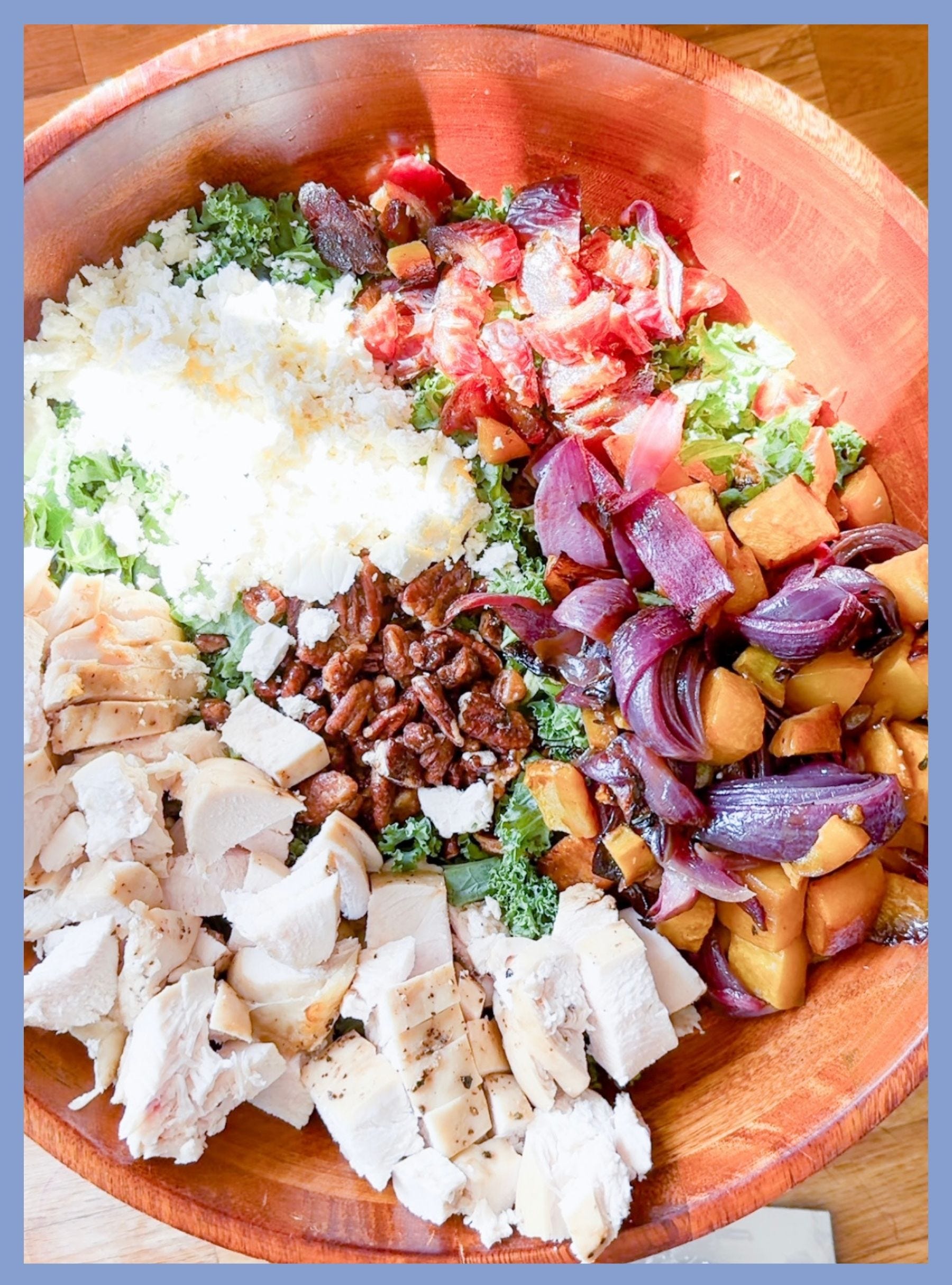 Rather than forcing a soup upon us simply because it’s the first official Saturday of fall, we’re going with a hearty and delicious good-all-week salad that is both cozy and fresh — one that meets the seasons in the middle. It has the fall flavors we’re yearning for like butternut squash, roasted red onion, apple, dates, thyme, and maple syrup, but also offers the cooling crunch our bodies crave when it’s 80- or 90-something degrees outside.