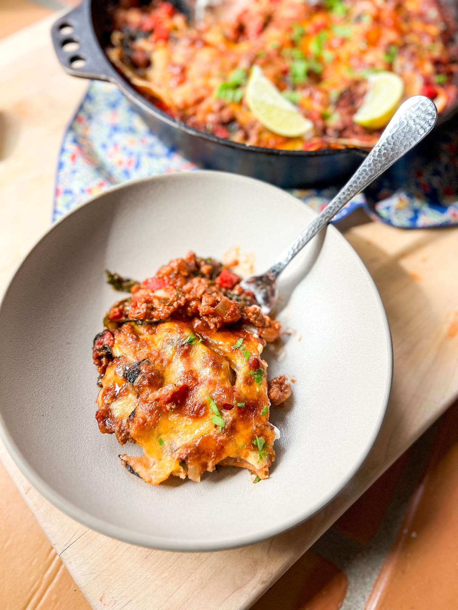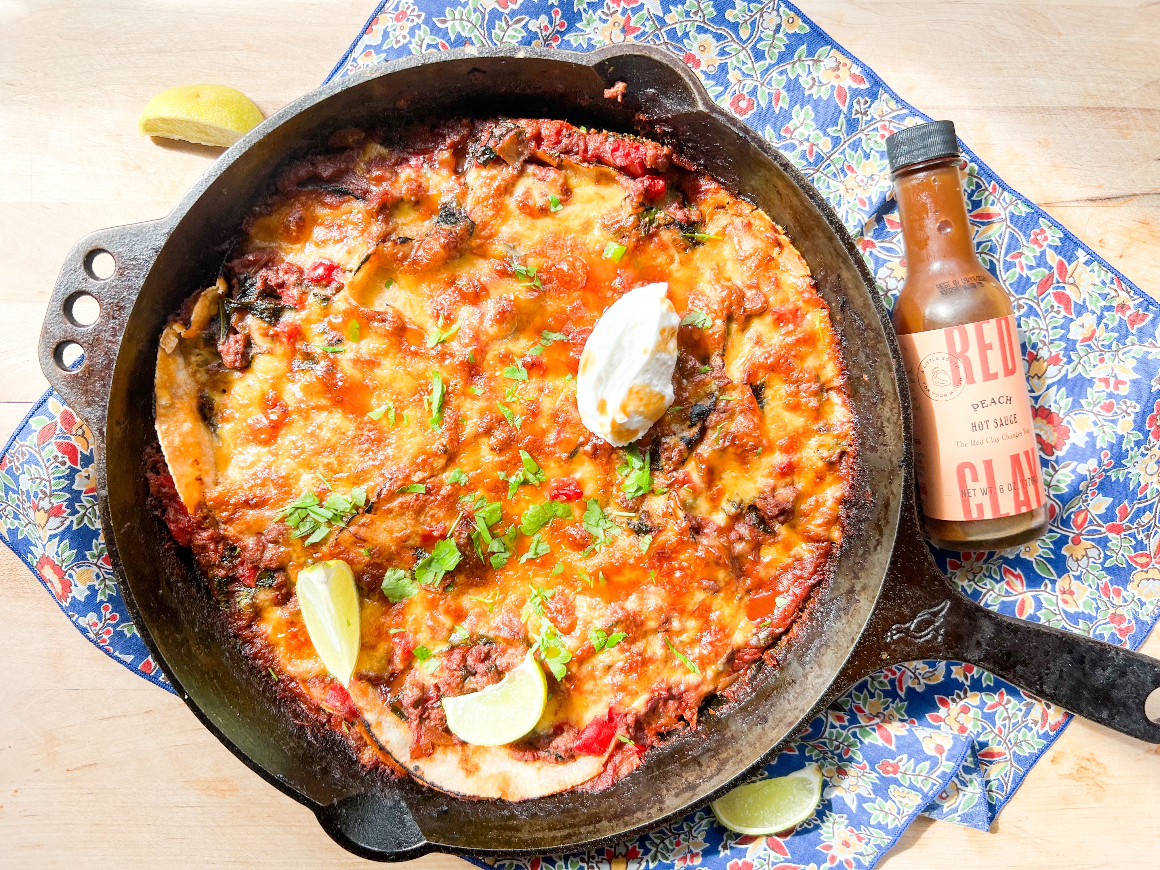 Spring’s in the air, our days are jam-packed, and I’m all about ease in the kitchen right now. Based on the love that last Saturday’s sheet-pan gnocchi (which only requires about 5 minutes of active cook time) got, I think many of you are too! So we’re sticking with the one-pot theme and making an absolutely delicious one-skillet beef enchilada casserole today. It only requires about 20 minutes of hands-on cooking time before it finishes up in the oven, uses as few tools as possible, is highly customizable based on what you’ve got in the fridge, and packs in a ton of nutritious veggies. It’s a perfect weeknight — or busy weekend day — meal.