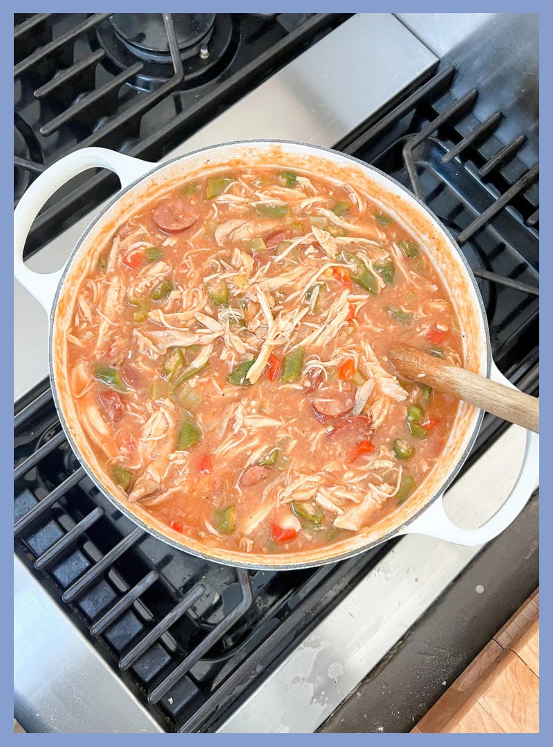 Lexie and Aaron buy a rotisserie chicken, shred it, and stir in the shredded meat for the final 5 minutes of cooking, but I honestly think it’s easier to cook the chicken ourselves, right in the gumbo. It adds more flavor too. They are not shrimp-in-gumbo people, and neither am I, but if you’re into it, you can stir in 1 pound of peeled and deveined U-30 shrimp for the final 4 minutes of cook time, either in addition to the chicken and sausage, or as a sub for one (or both — use 2 pounds of shrimp instead if that’s the case).