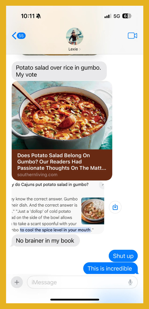 I’d never heard of this before, but apparently some people put potato salad in — or on the side of — their gumbo!? I’ve always served mine with a big scoop of buttery white rice and literally would have never considered bringing potato salad into this mix. If you’re a potato salad/gumbo lover, I’ve GOT to know more. And if you want to try it, Lexie says, “store bought is fine.”