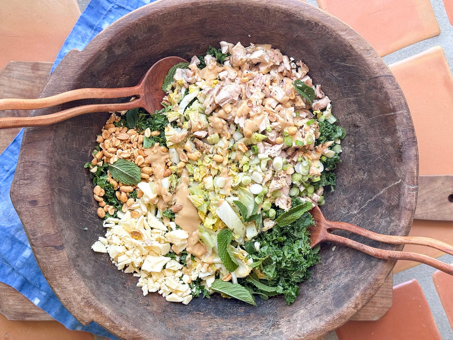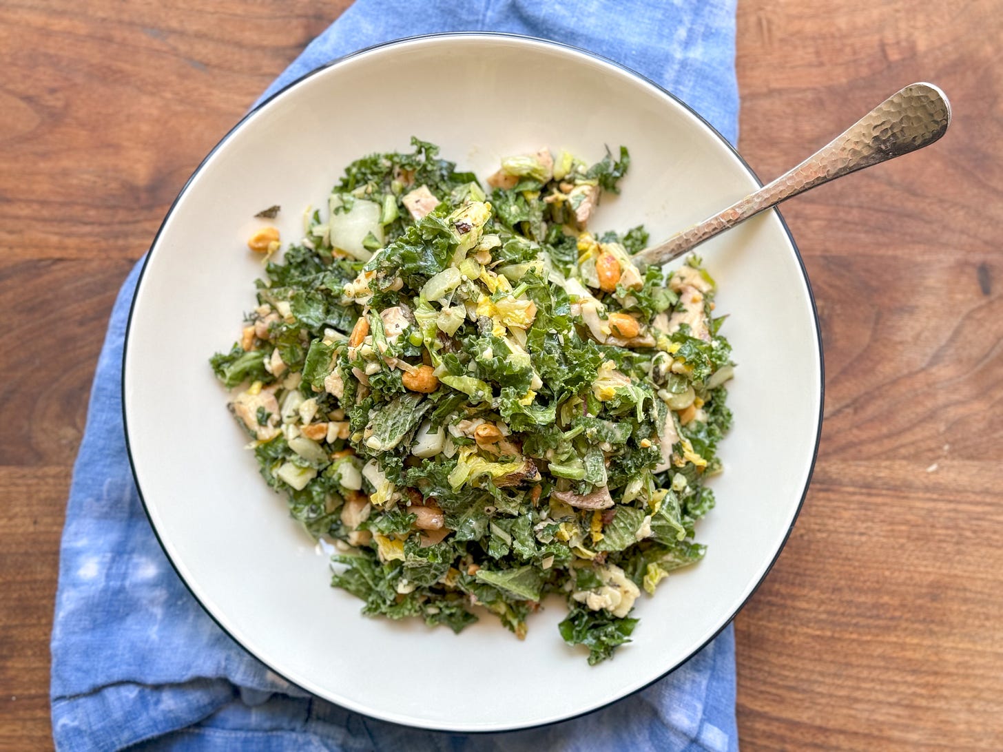 As you all know, I love roasty, frizzly cabbage, I love kale, and I love a peanut sauce, so a salad that combines all three of those plus fresh herbs, peanuts, white cheddar, and chicken is the stuff of dreams.