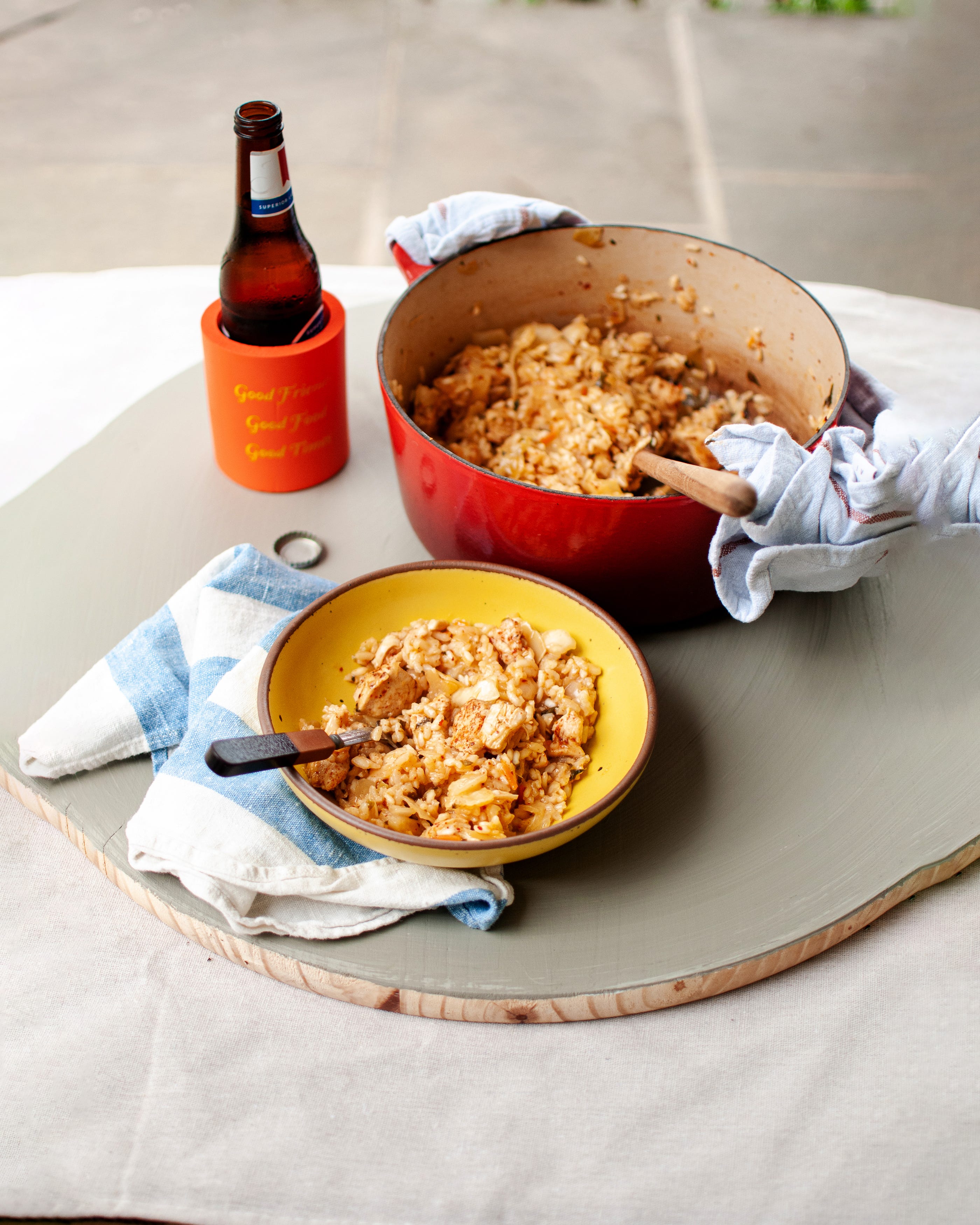 We’re making Julia’s chicken + kimchi rice1, turned cheesy, like she recommends in the headnote. This is an absolutely stunning one-pot, five-ish ingredient meal. The entire meal takes only about 5 minutes of active cook time, then 20 minutes for the rice to cook, and 10 minutes for it to steam. At the end you have a big pot of comforting, nourishing, cheesy rice with chicken and kimchi!