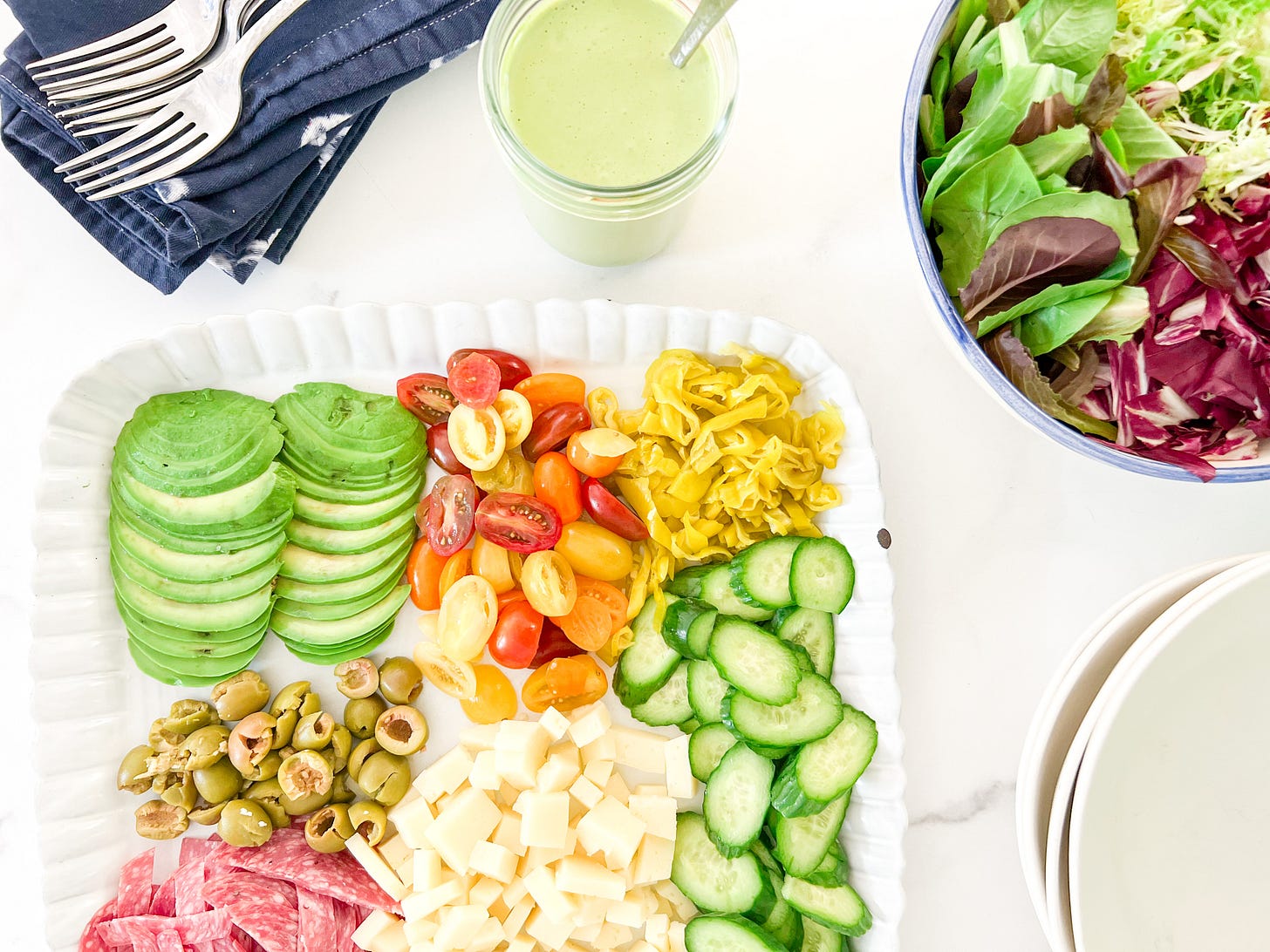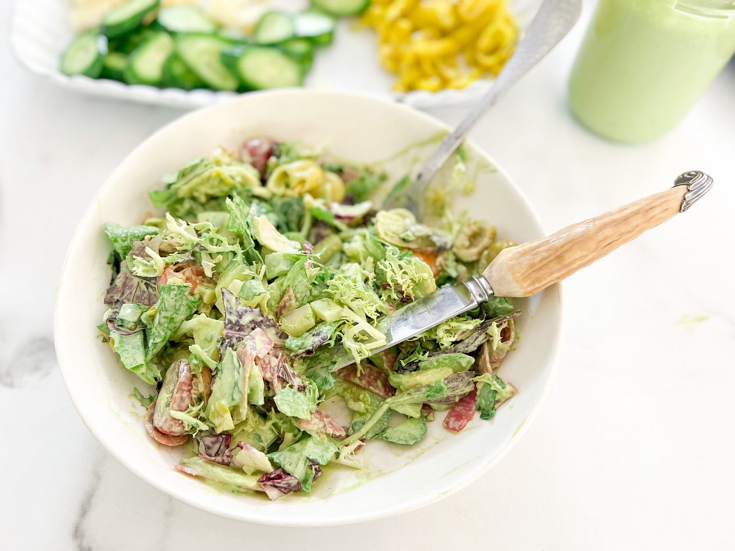 For this week’s recipe, I merged two of the all-time greats: a fully loaded chopped Italian salad with a perfectly creamy, herby, zingy green goddess dressing.