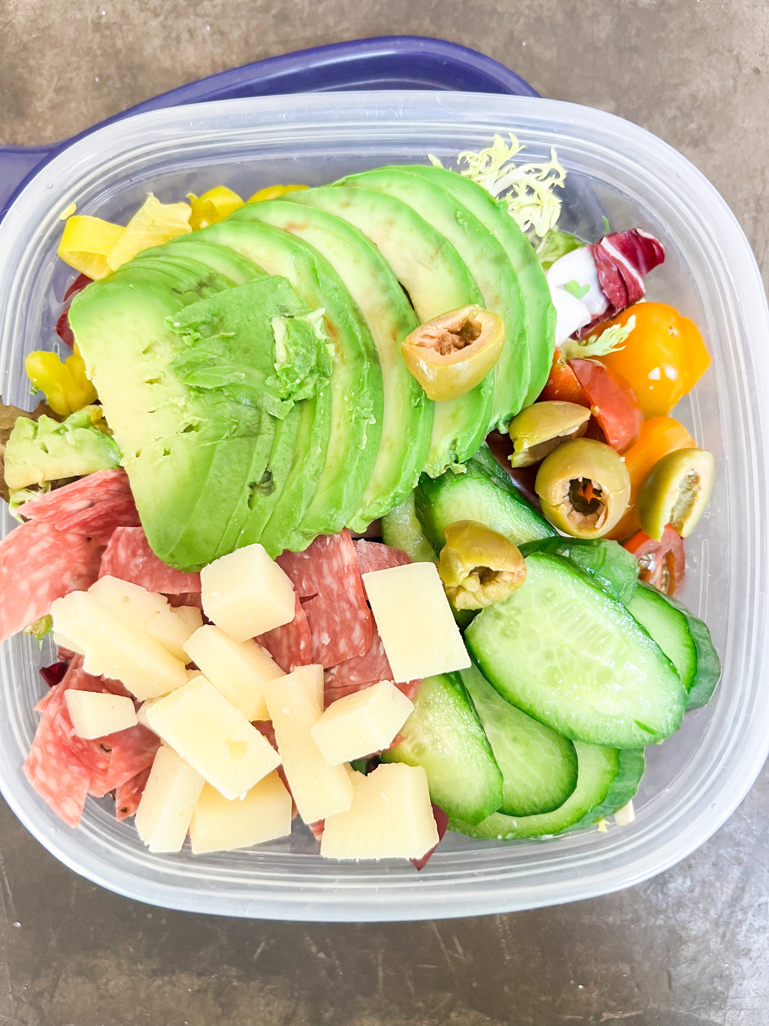 Great meal prep potential here! Toss the greens together and keep those in one container. Store all of the other ingredients in separate little containers. I’d also grab a rotisserie chicken and shred that up to have some protein variety. Mix and match and make salads or little snack platters for yourself all week long!
