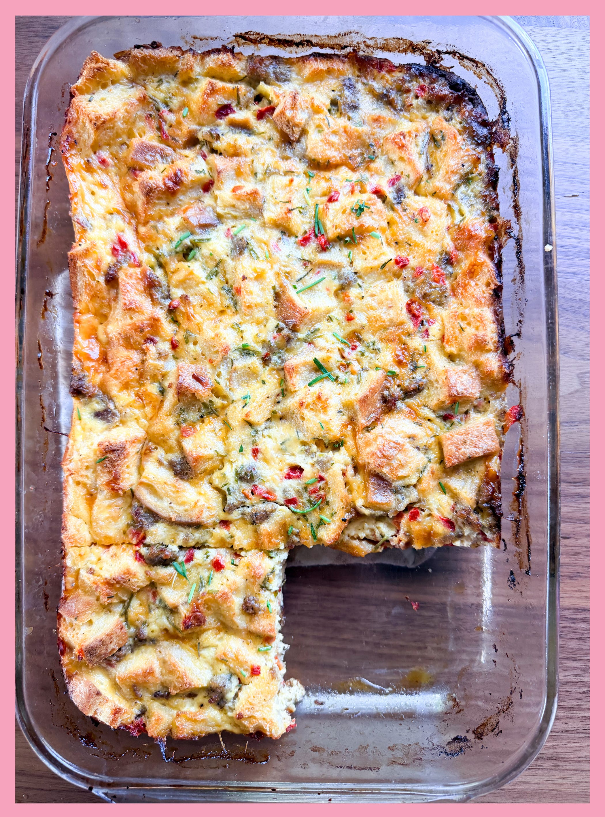 I’m so excited to share today’s recipe: It’s my mom’s iconic Christmas morning breakfast casserole! We ate this every single Christmas after running down the stairs and tearing into our stockings. We had to wait until after we ate to unwrap the rest of our gifts, so when we were little, my sister, brother, and I would stuff our faces as quickly as possible so that we could get back to business.