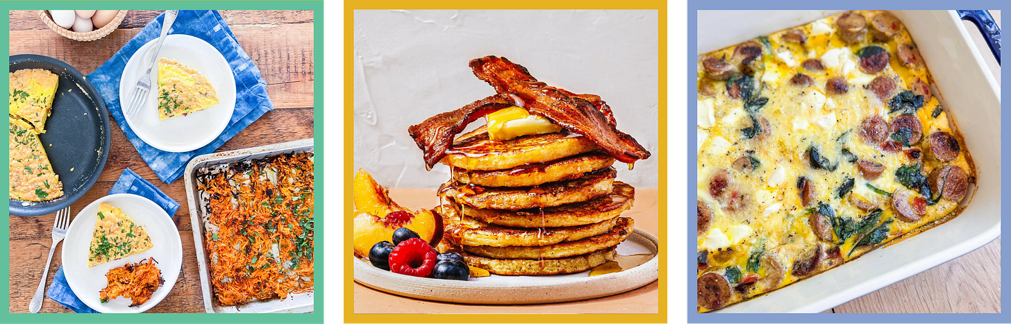 If you, too, are still obsessed with Starbucks’ egg bites, my Starbucks egg bite copycat frittata with sweet potato hash is for you. Also, that sweet potato hash would be a perfect side for any holiday breakfast/brunch spread! Don’t forget that Samin Nosrat shared her recipe for ricotta custard pancakes, which she describes as “heavenly clouds of fluff,” during my maternity leave with Tavish. And y’all have been loving the chicken sausage, spinach, and white Cheddar egg bake from the back-to-school meal plan we shared in August.