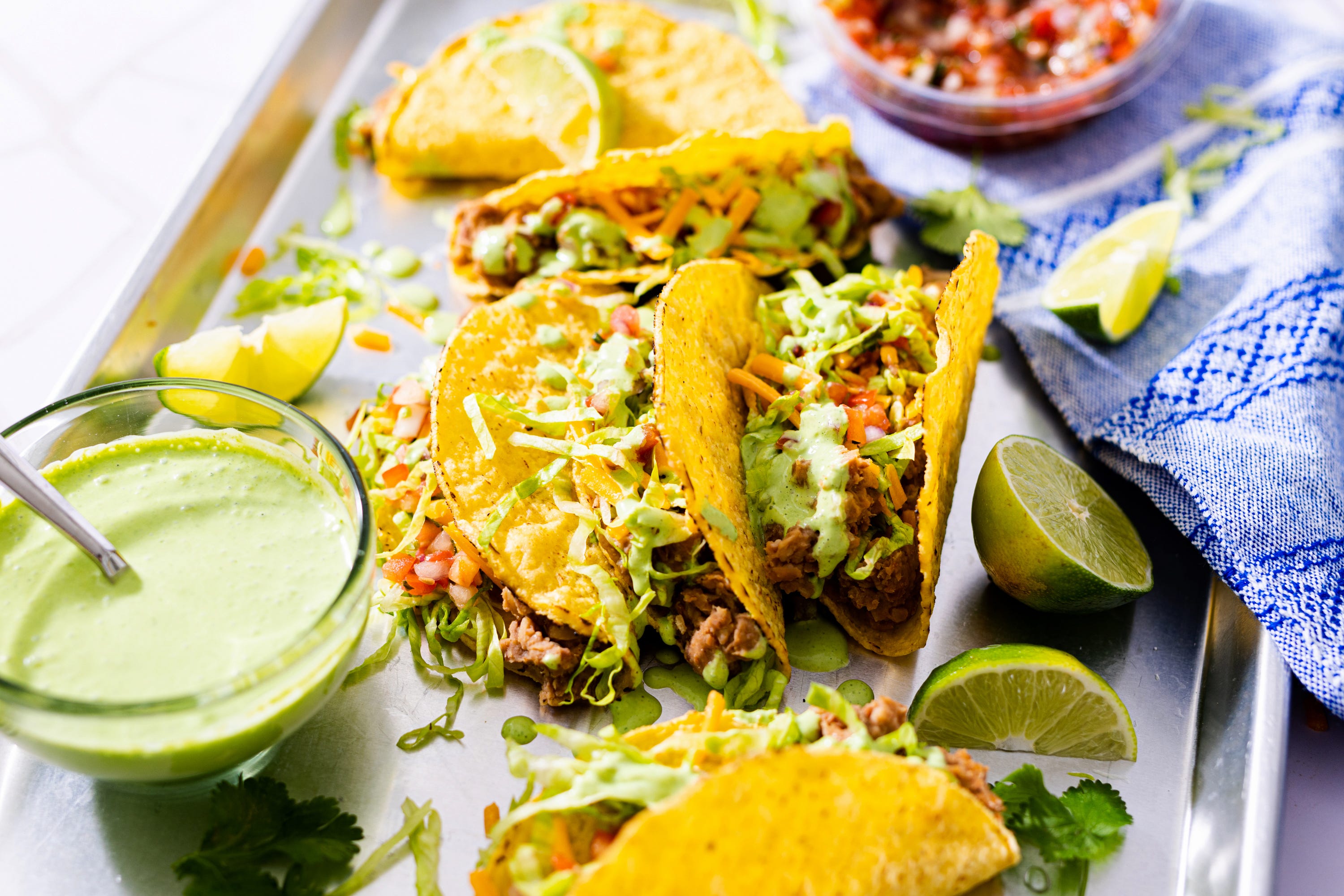 Refried beans, shredded iceberg lettuce, shredded Mexican cheese, and a ridiculously tasty, creamy green sauce. Loaded into crunchy taco shell. It’s nostalgic, it’s delicious, it’s shockingly good for you. There’s no meat, but there’s just as much protein between the beans and the Greek yogurt. It’s budget-friendly. These tacos check all the boxes.