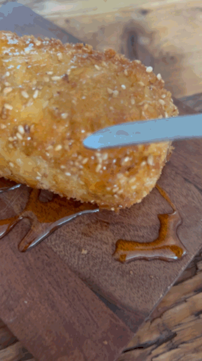 Consider freezing the chèvre if you’re trying this for the first time. The coating & prep work is pretty easy but the stiffer the cheese, the more forgiving the recipe. I also doubled up on the sesame seeds for a tastier & more interesting texture. It’s a challenge to get the outside crispy enough without making a mess in the pan. Keep the oil hot. And remember, the heat keeps cooking the interior even after you remove it from the pan.