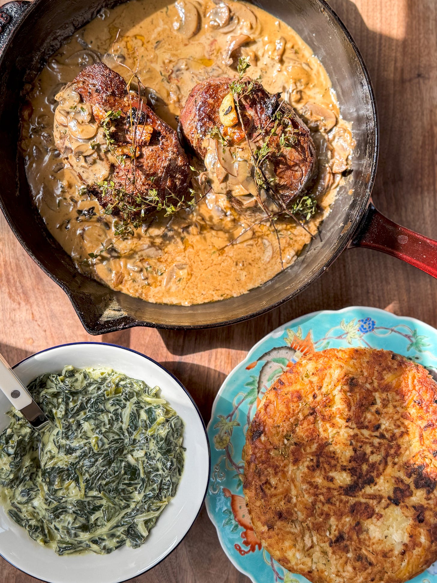 This meal serves 2 to 4 people. To serve 4, simply cook 4 filets — there will be plenty of creamed spinach and hash brown to go around. If you’re cooking for 4 ravenous people (I see you, teenager moms!), cook everyone their own steak and double the creamed spinach and the hash brown by cooking it in a 12-inch skillet (just be careful when flipping! You got this! And if it falls apart no prob — it’ll taste just as delicious, just smoosh it back together and carry on!). If you’re cooking for 2, just cook 2 steaks and enjoy any hash brown and creamed spinach you may have left over for brunch the next day! Scramble some eggs, maybe cook some bacon, and you’ll be good to go.