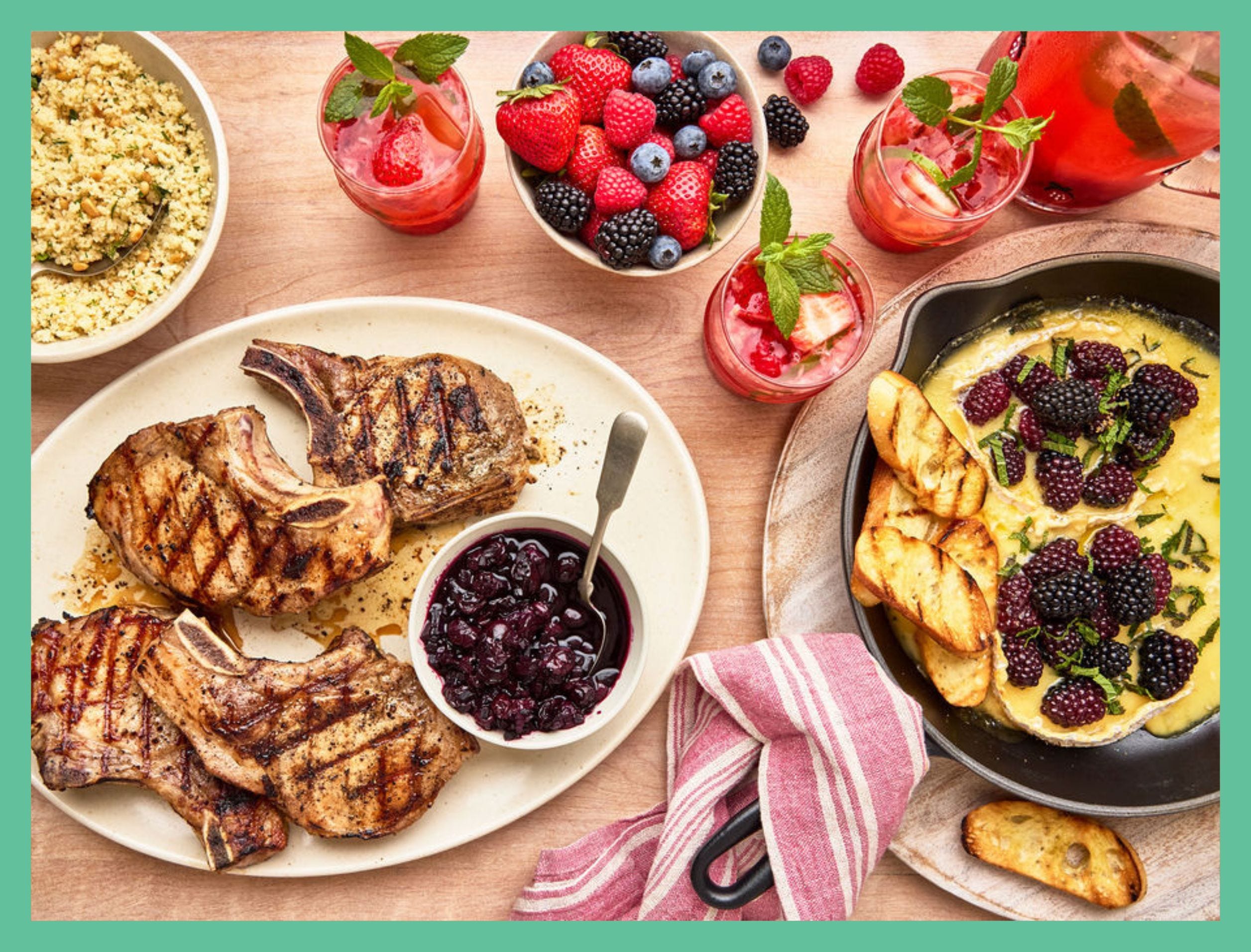 I’m so excited to share this summer feast with you!!! It’s a perfect menu for a special occasion summer supper or a casual dinner party with friends. The pork chops and couscous are also great for any old weeknight. Here’s what we’re making: