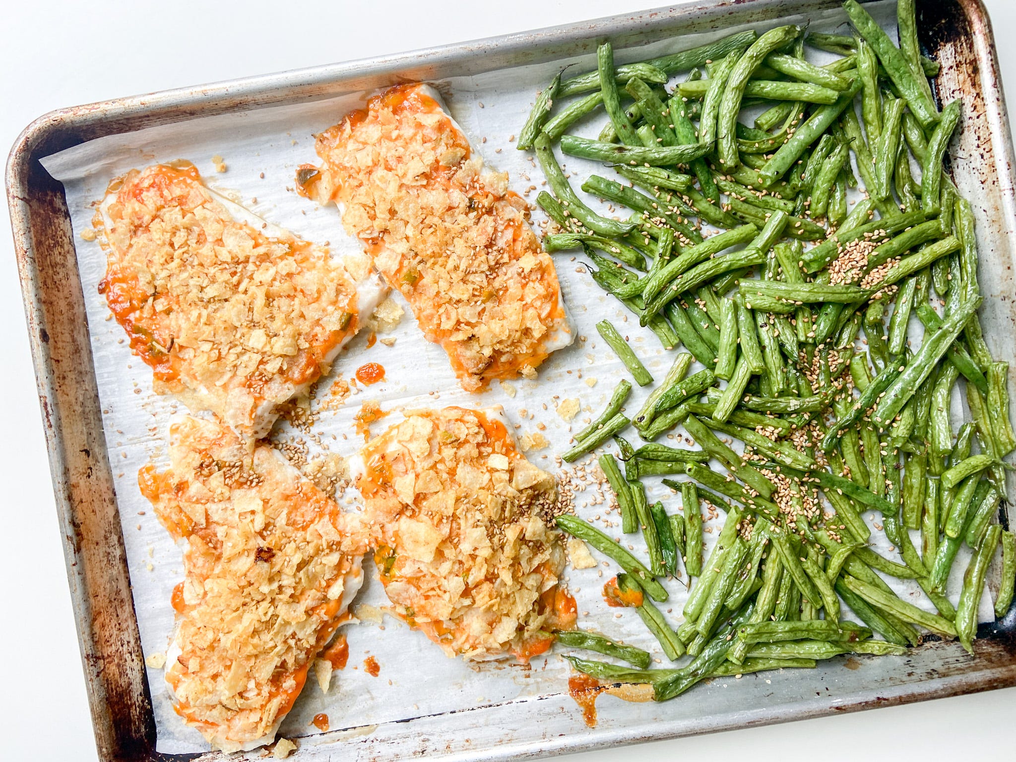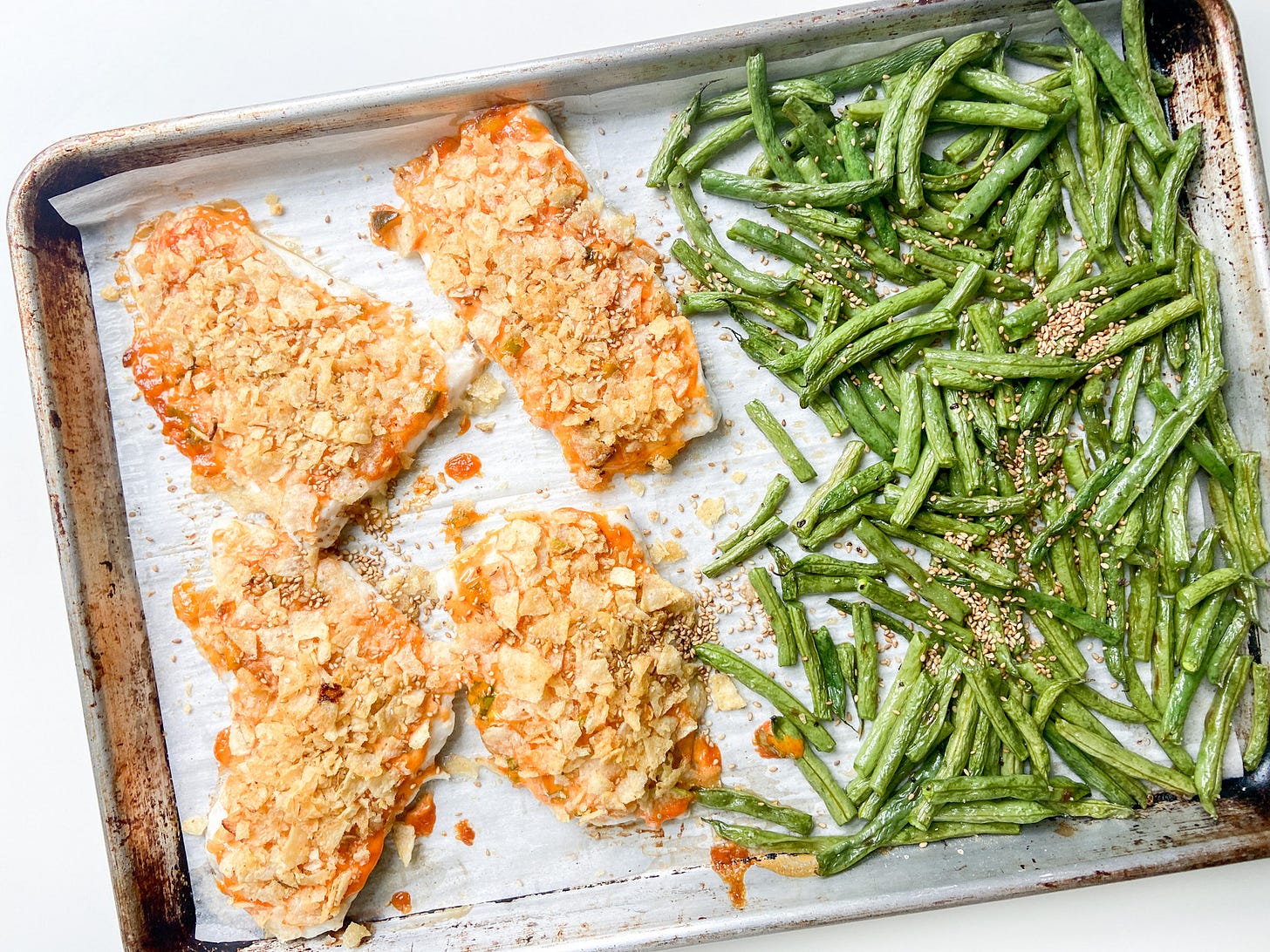 Rockfish: Any mild white fish like cod, halibut, mahi mahi, tilapia, pollock, haddock, or sole. Peeled and deveined shrimp would be delicious — they’ll need to bake for 7-9 ish minutes (so, start the green beans first, then add the shrimp). Cluster them together so it’s easier to spread the tartar sauce and chips on top. If you don’t like seafood, you could sub in 1 1/2 pounds of boneless, skinless chicken thighs. They’ll need about 35 minutes of cook time to reach an internal temp of 165°F, so start them first, then add the green beans when you have 20 minutes left. Chicken breasts or tenders would also work (they’ll need to bake for 15 to 20 minutes). See “vegetarian” note above for another sub.