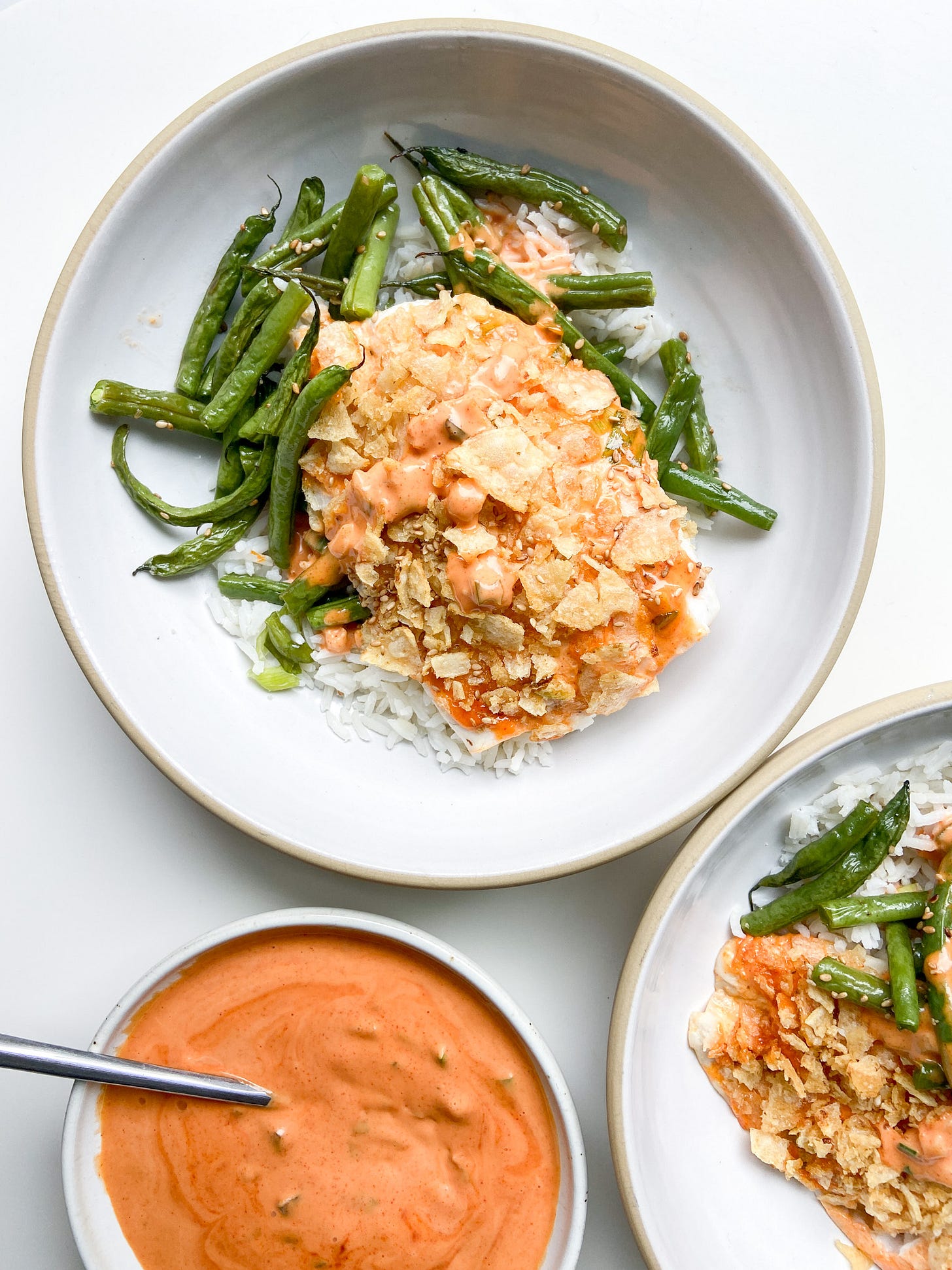 “fish and chips” bowls with sesame green beans and gochujang tartar sauce