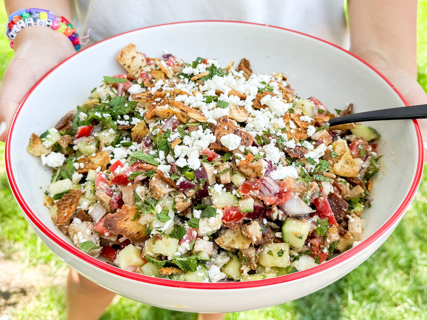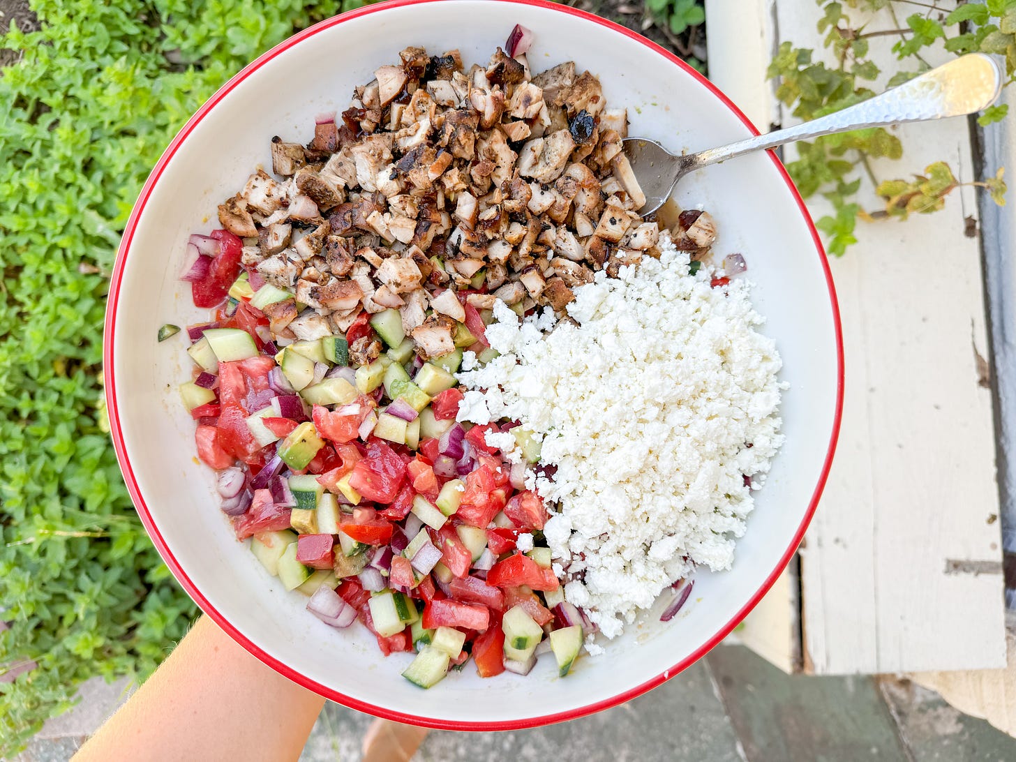We’ll start by seasoning some chicken and pre-heating the grill, then move on to dicing up cucumbers, tomatoes, red onion, and avocado. Grill the chicken and some pita (or just buy pita chips), then toss it all together with a lemon vinaigrette plus lots of mint and feta. This meal is inspired by fattoush, a Middle Eastern salad with cucumbers, red onion, tomatoes and fried pita, but my version adds chicken and avocado on and swaps in a bright lemony vinaigrette.