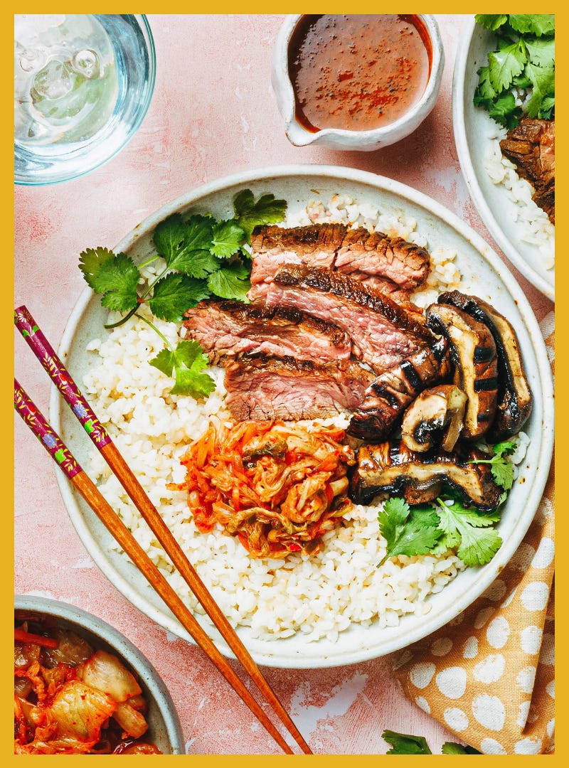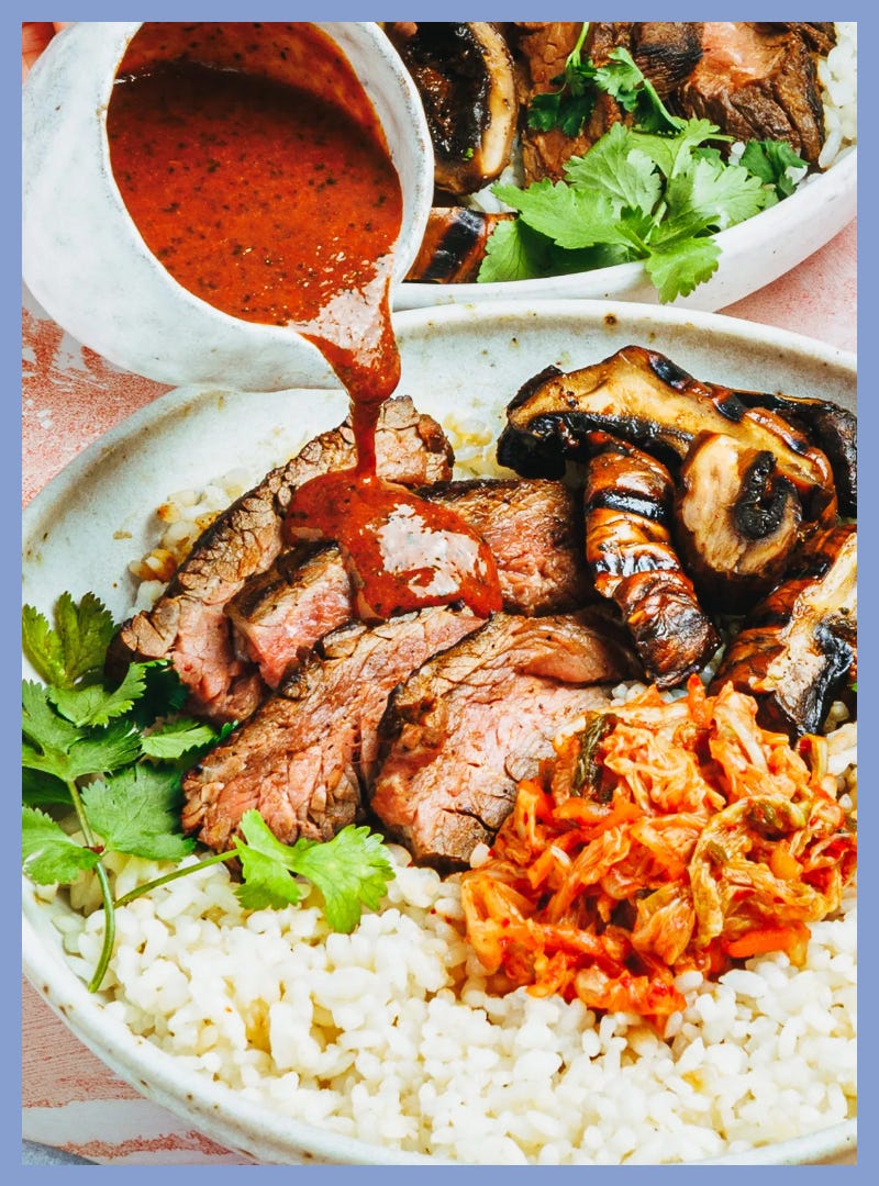 grilled gochujang beef and mushroom bowls