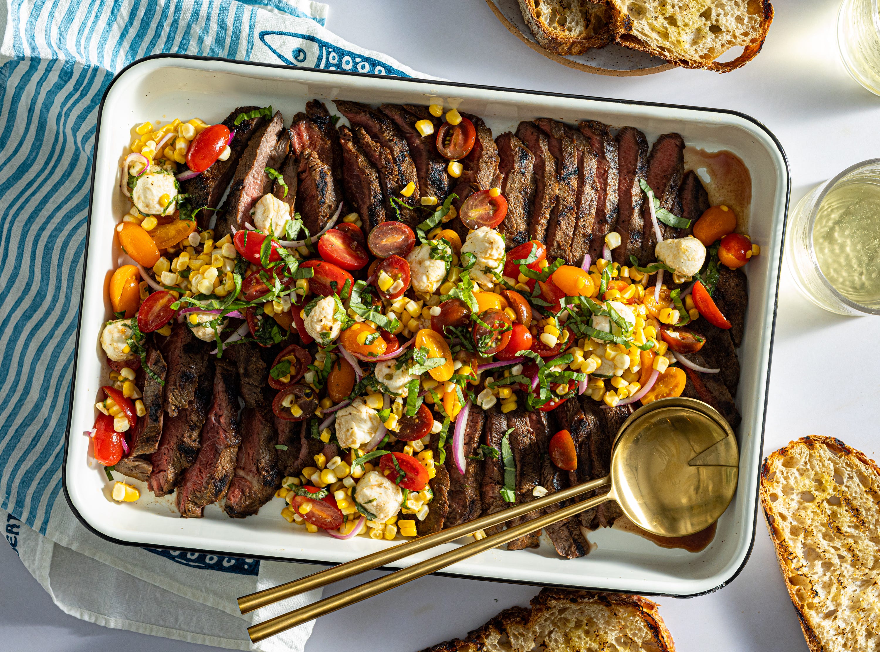 The combination of the grilled steak with the acidic tomatoes and creamy mozzarella truly makes for the perfect bite of food. We’re adding grilled corn to the mix because… I can’t not. When corn is in season, it’s all I can think about. Feel free to omit it and add a diced avocado instead (or in addition!).