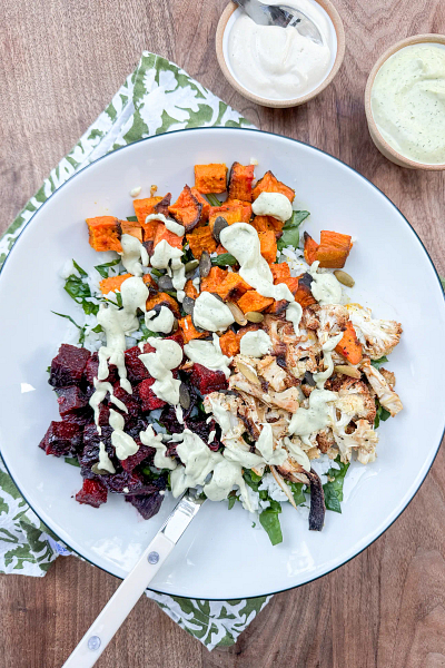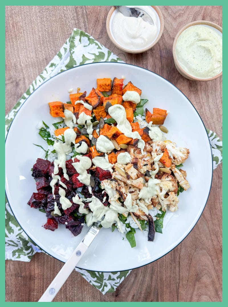 Scoop some grains and greens into the bottom of your bowl. Add the roasted veggies. Drizzle a big scoop of sauce over top and add any other toppings you’re into. Dig in!!!!