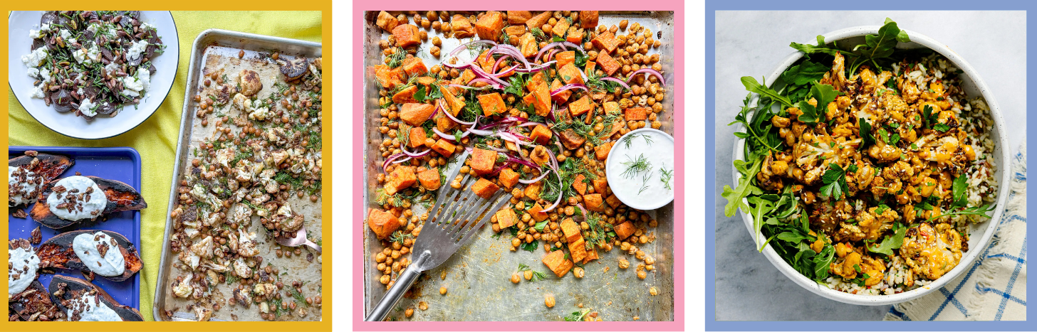 Here are a few more delicious vegetarian meals we’ve made in the past (from left to right): market plates (I’m realizing we’re cooking the same veggies in a different (speedier) format here, it happens lol), sheet-pan roasted sweet potatoes and chickpeas with whipped feta, and crispy white bean & cauliflower tahini bowls (this is vegan too and an all-time fave of mine). PS, if you can’t get enough of this recipe’s cashew sauce, you’ll love the thai chicken chop I mentioned above!