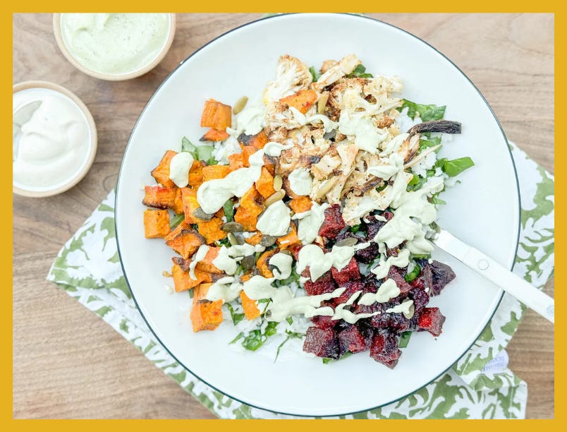 We’re seasoning sweet potato, beet, cauliflower, and red onion with EVOO (another good mood food) and some spices you probably already own, but you could even just season them with kosher salt and pepper, if that’s all you’ve got! While those roast to perfection, we’re going to make a very tasty cashew sauce, prep whatever grain you want, and wash and chop some greens. As soon as the veggies are done, you’ll assemble your happy bowls, drizzle them with cashew sauce, and dig in!