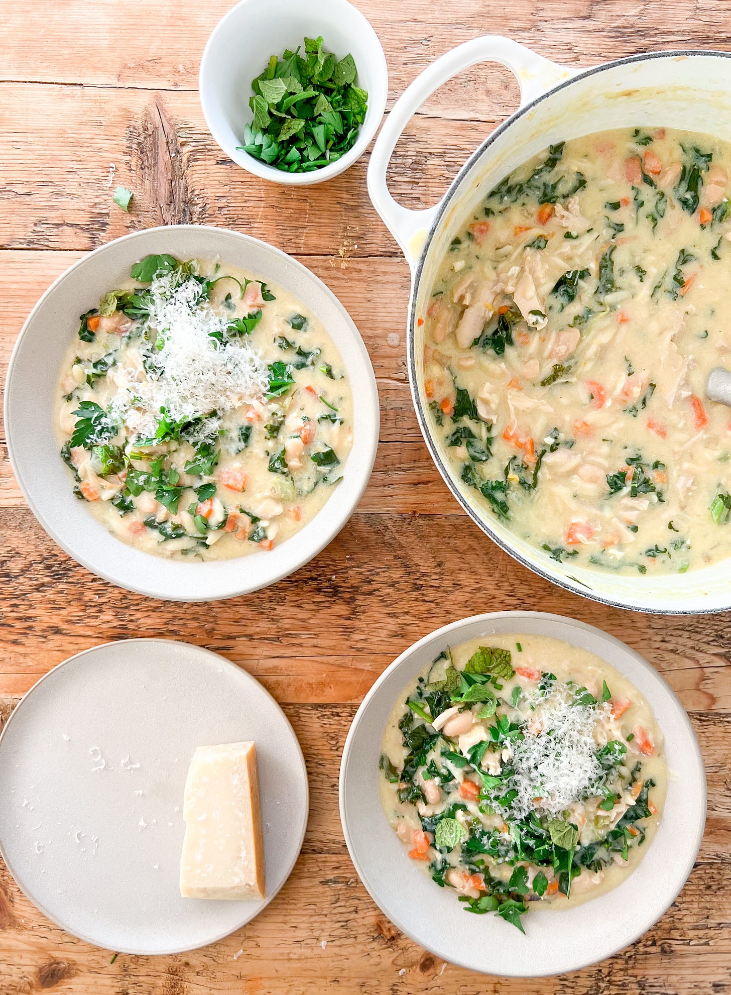 Avgolemono is one of my favorite soups — it’s a simple chicken and rice soup that is thickened with eggs. For this soup, I stole the egg-thickening technique from avgolemono then added lots of veggies and greens and some Parm and fresh herbs for that *je ne sais quoi* flavor explosion. Basically, this is avgolemono with more substance to it. It’s a delight.