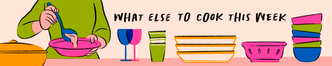 Wednesday: Sheet-pan chicken, cauliflower, and potatoes (Use leftover pesto instead of making the sauce in the recipe. Or if you already used all of the pesto, make this anyway and make the green sauce. It’s sooo gooood.)