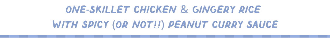 The chicken and rice skillet with peanut curry sauce that I am sharing today is one such riff off of a recipe in the book! The base recipe is a very delightful one-skillet chicken & gingery rice with coconut curry sauce, but by simply adding a tablespoon each of peanut butter and sriracha (if you’re feeling spicy) to the sauce, it gives the dish a totally new vibe.