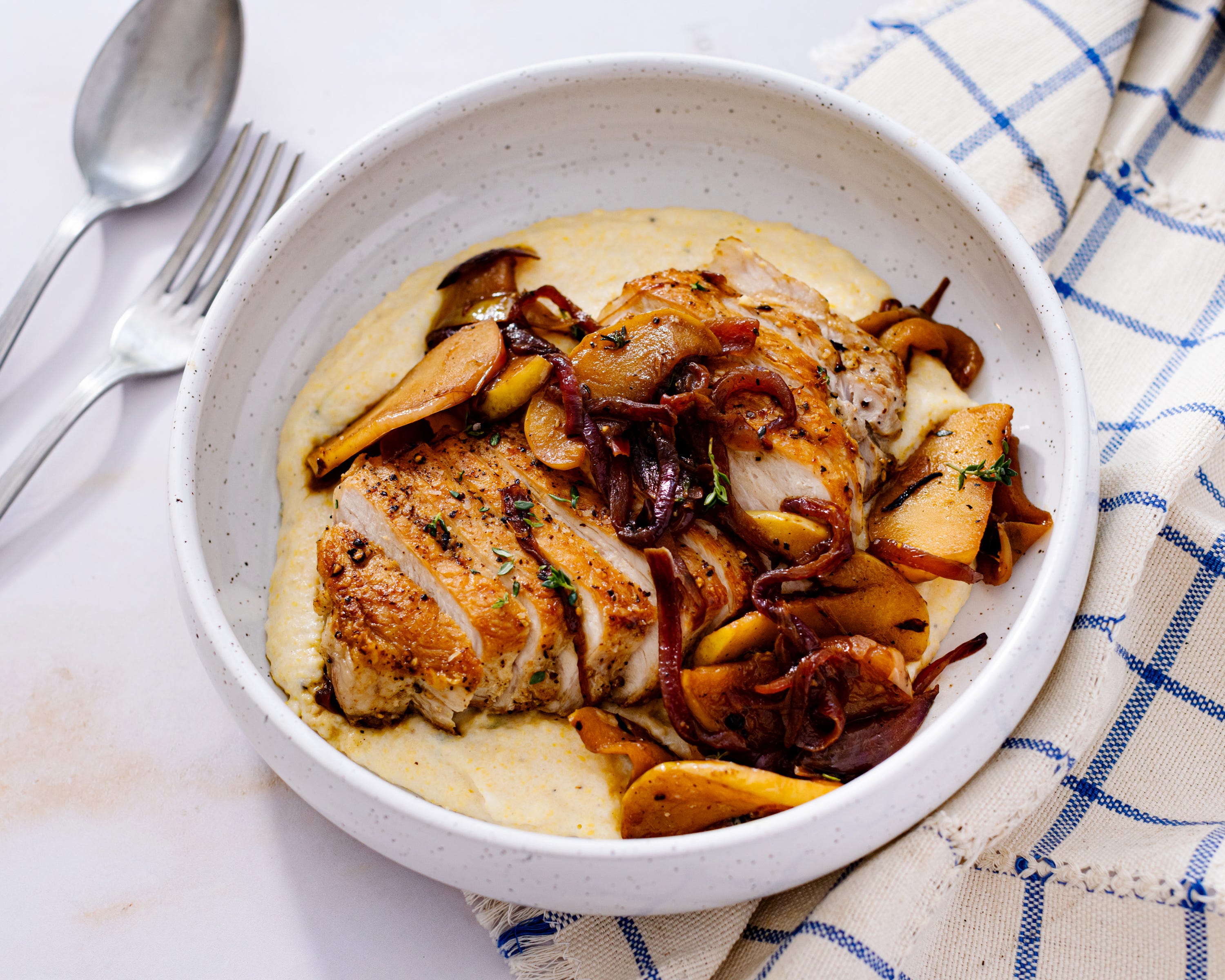 While the apples and onions cook, you’ll whip up a quick batch of polenta to serve under your pork. In the end, you’ll have a really gorgeous, special meal on the table in under 30 minutes.