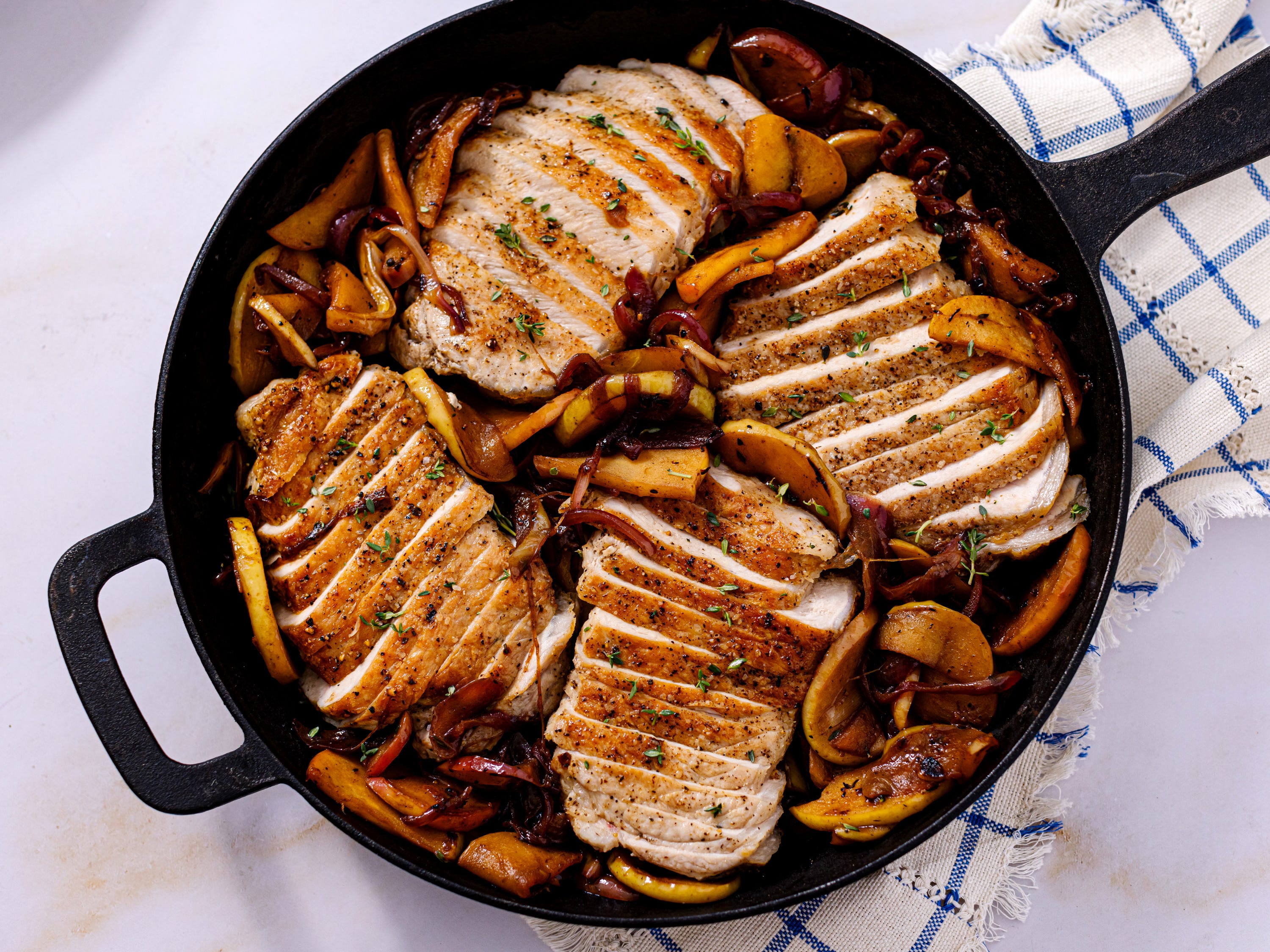 In this recipe, we first cook the pork chops in a skillet, then use that same skillet to cook apples and onions into tender, delicious submission. Stirring in apple cider vinegar and butter at the end melds everything together into a delightful sauce.