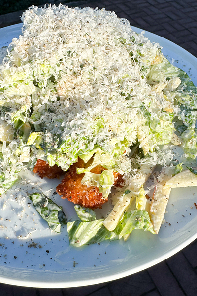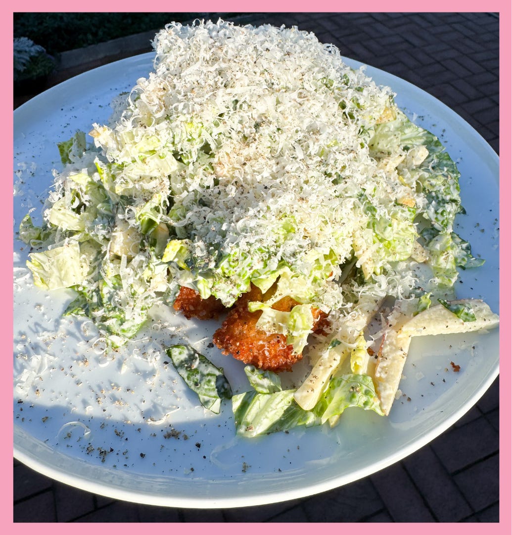 Place one schnitzel on a plate and cover with salad. Use a microplane or box grater to grate fresh Parm all over the top. Add a few grinds of pepper. Repeat with remaining plates. Done! ENJOY IMMEDIATELY!