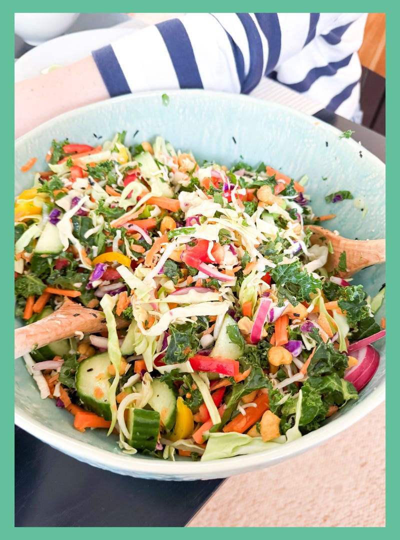 Pour 3/4ths of the dressing over the salad and toss to coat. Add additional dressing as needed (I use it all!). Taste and season with additional kosher salt as needed (there are a LOT of raw vegetables in there — I needed to add several big pinches of salt to bring out all of their best flavors! Keep tasting between additional pinches until it’s perfect!)