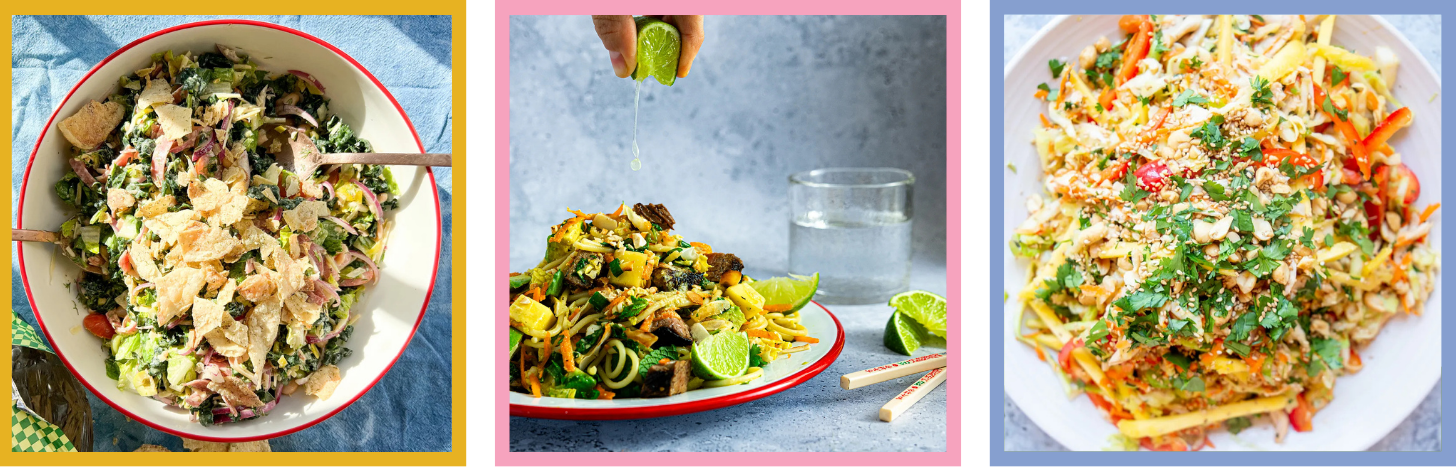 Use pre-shredded ingredients. Combine 2 bags shredded cabbage (ideally one purple and one green) 1 (10-ounce) bag shredded kale, 1 bag shredded carrots, 1 crushed bag ramen, 1/2 cup cashews, and 1 shredded rotisserie chicken breast with your desired amount of this dressing OR swap in a store-bought sesame-ginger dressing (here’s a good one). No chopping necessary. Delish.