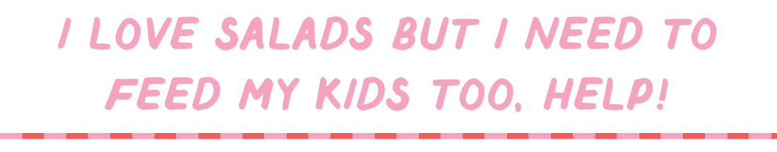 My kids got chopped rotisserie chicken with ketchup for dipping (duh), cucumbers, carrots, and cashews. Deconstructing salads for kids is such a great way for the whole family to, sort of, eat the same thing and allow you to eat a salad for dinner without having to cook something separate for them. Or, cook them one of my no-fail kid dinners — click here for the list — and make this salad for yourself! You deserve it!