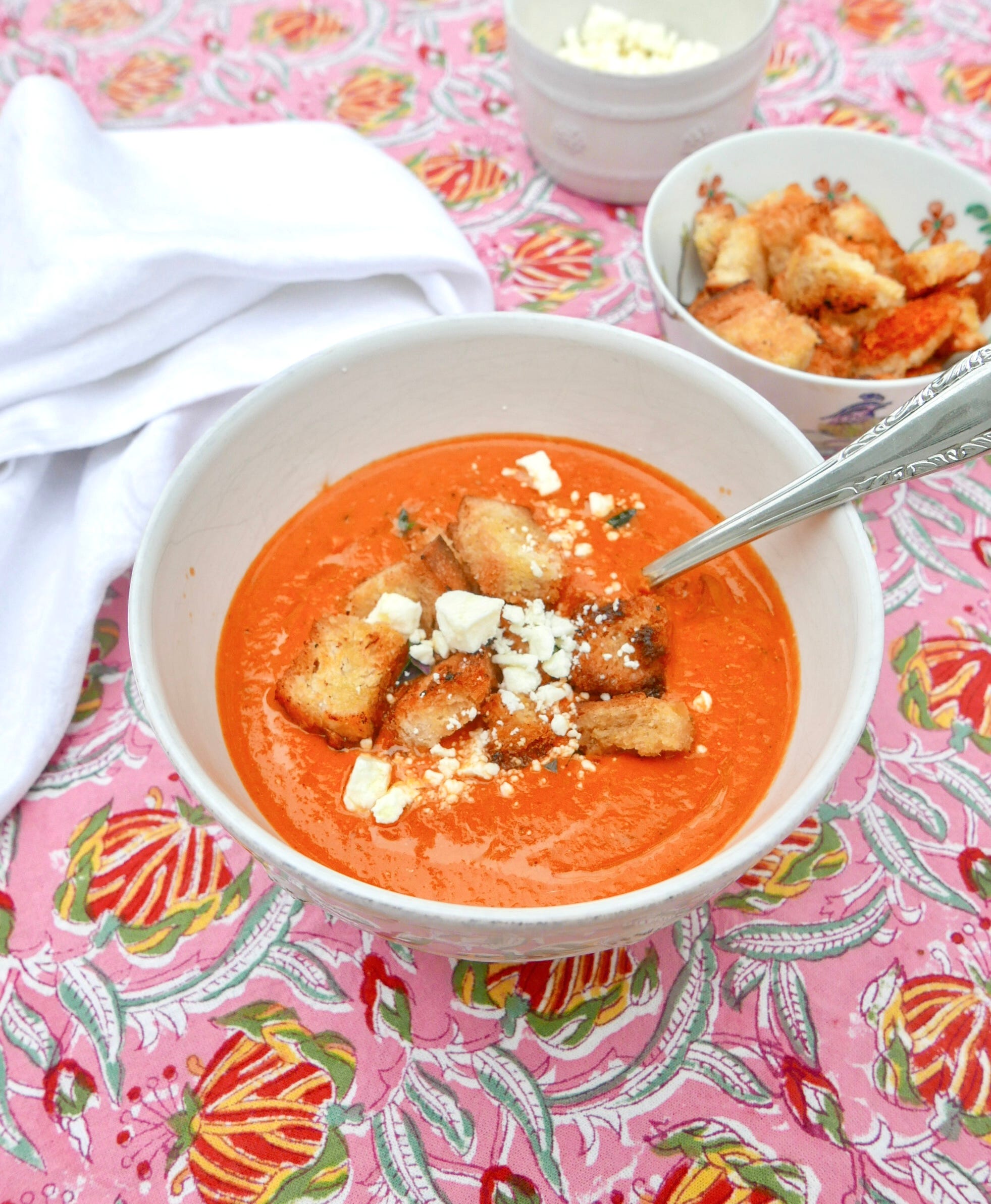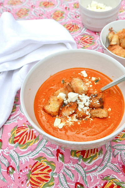 I like a tomato soup + grilled cheese combo: I hear ya. In that case, use the bread to make grilled cheeses instead and dunk them into the roasted red pepper soup!
