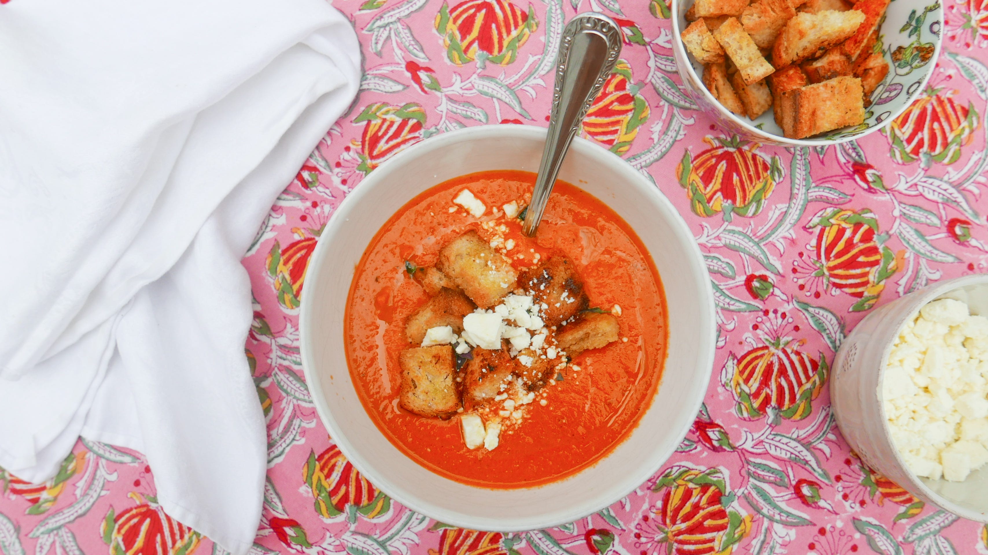 To start, we’re going to roast a sheet pan worth of nutritious veggies — two bell peppers, an onion, a cup of butternut squash, and a whole head of garlic — and flavor them with smoky paprika, thyme, and red pepper flakes. Halfway through the cook time, we’ll add some cubed bread to make crispy croutons to top our bowls with — a move you’ll want to repeat again and again, if you aren’t already in the habit of making homemade croutons. Once the veggies have roasted, we’ll blend them up with some broth, then add sour cream to balance out the sweetness of the roasted red peppers and to make things super creamy. This soup has some kick thanks to the smoked paprika and crushed red pepper flakes — if you don’t want any heat, you can omit the red pepper flakes altogether.