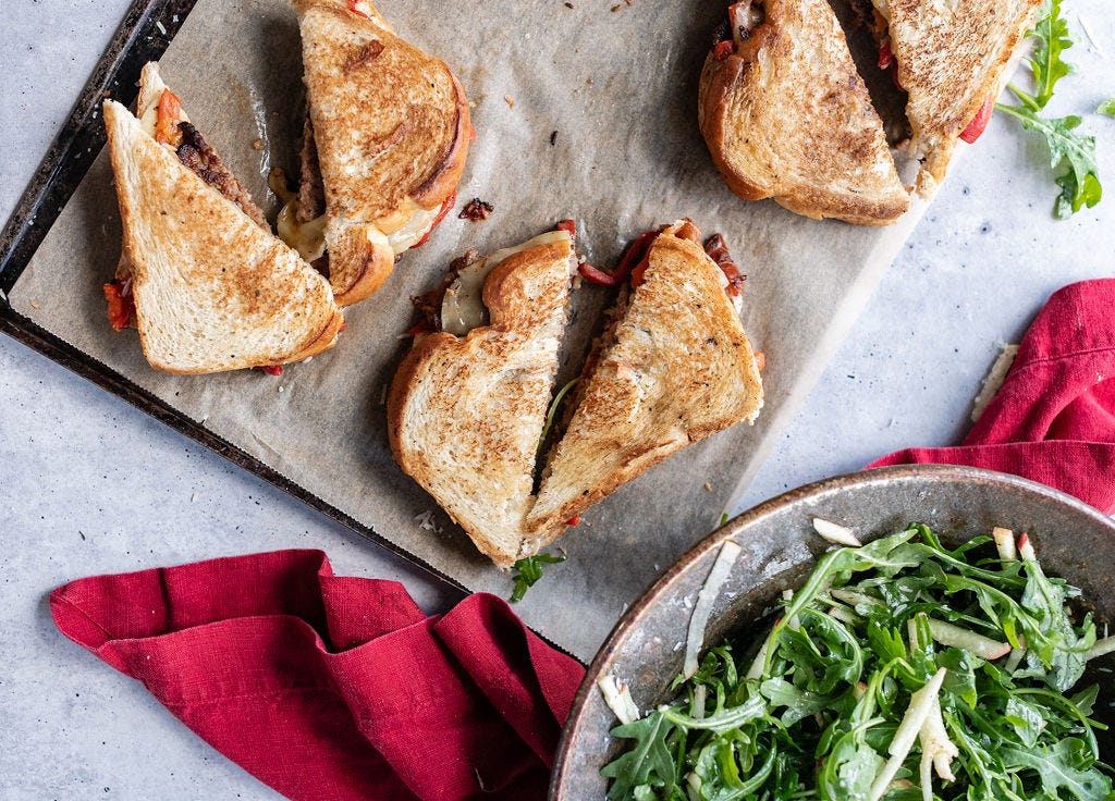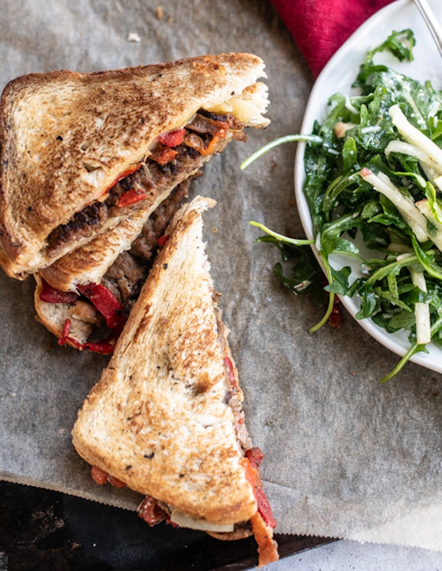 This spin on patty melts solves that issue! Instead of beef, we’re making thin smashburger-style patties out of ground Italian sausage, which comes preloaded with spices and aromatics like fennel, garlic, and paprika. And instead of caramelized onions, we’re using jarred roasted red peppers. They complement the sausage perfectly and give our sandwiches a soft, sweet bite like we’d get from caramelized onion — but with zero time and effort.
