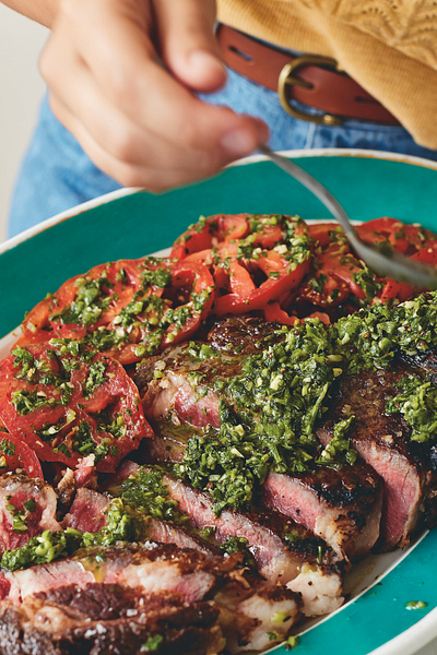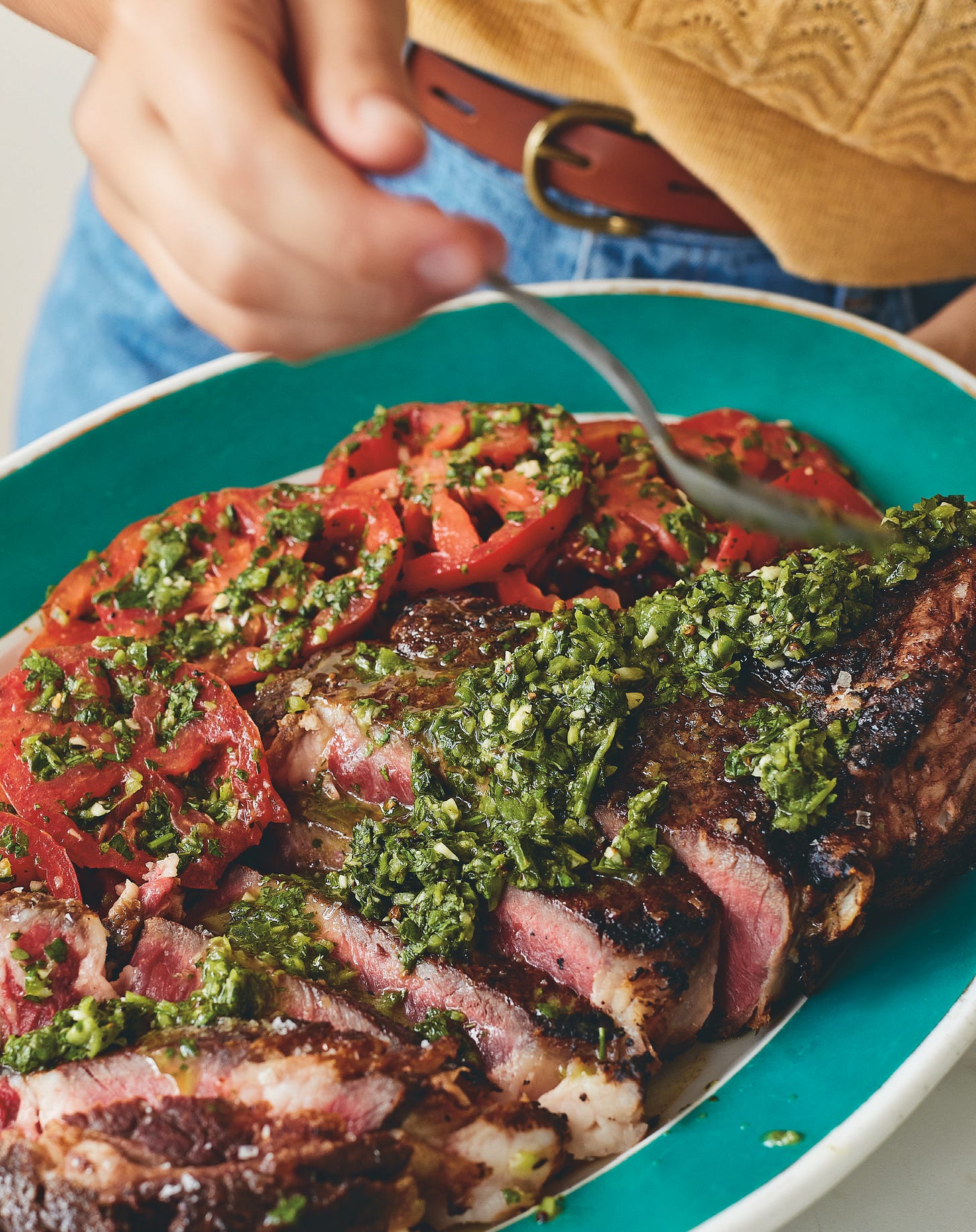 While intimidating at first, a steak is one of the easiest things you’ll learn to cook in your home kitchen, and it makes a decadent, yet quick and simple, dinner. You don’t have to go all out and splurge on a bone-in rib eye on a random Tuesday night; save it for a special occasion. You can still try this recipe with a thinner rib eye or other preferred cuts. I like to pair my medium-rare steak with zhug — a spicy green Yemenite sauce packed with fresh herbs and spices — that I serve on top of the steak and use to marinate the tomatoes too.
