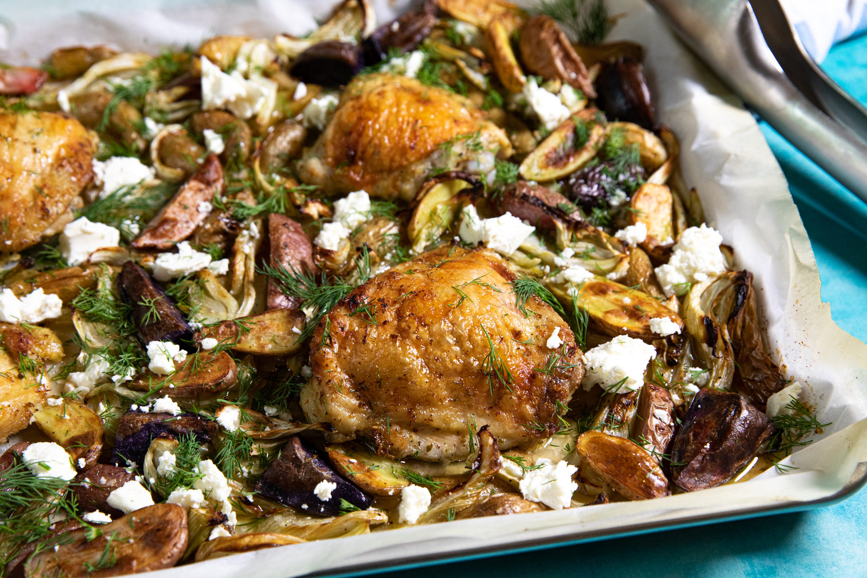 Here, we’re adding chicken to the mix, which frankly makes it a far superior dish than the original. The potatoes and fennel roast in the chicken fat, becoming incredibly tender and flavorful.