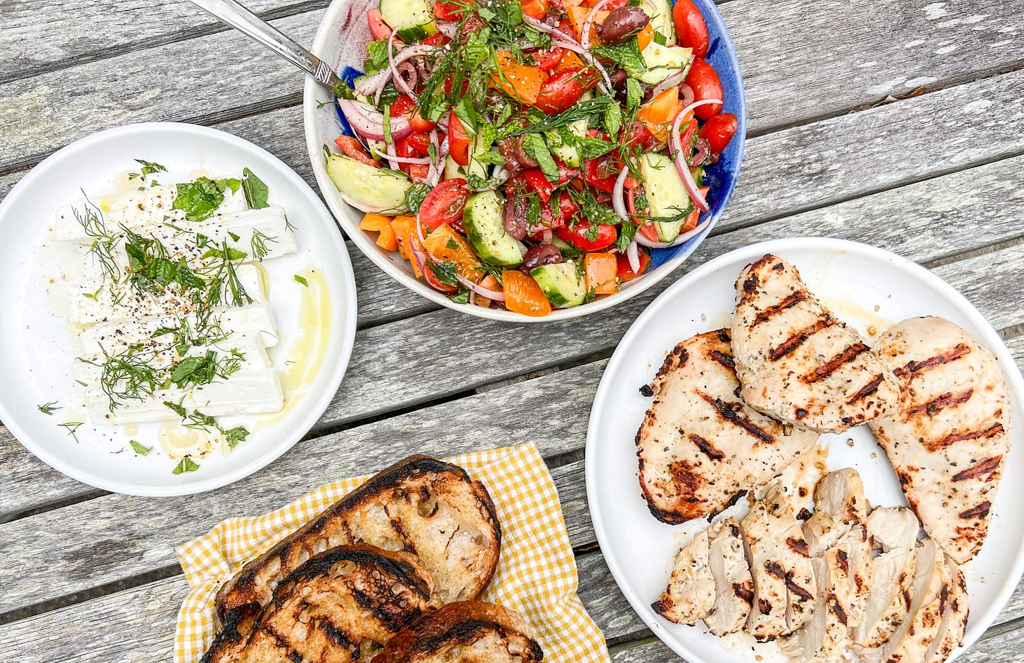 I’ve put my spin on the traditional salad, and added some ABSOLUTELY DELICIOUS yogurt-marinated chicken, toasty grilled bread, and fancy feta to turn a standard fare salad into an extremely show off-y feast.