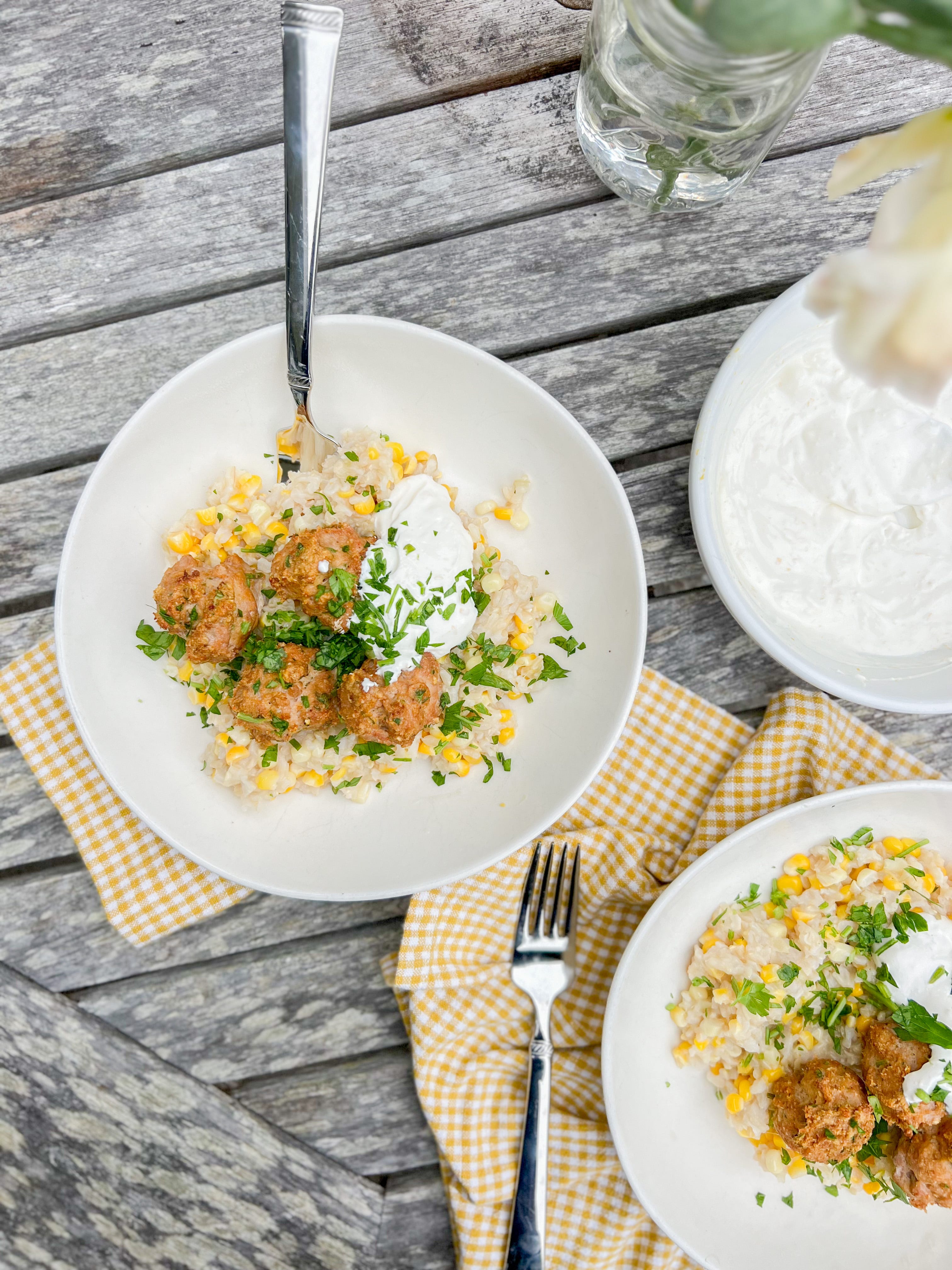 For this meal, we’re serving corn butter rice beneath the most delightful spiced, herby turkey meatballs. We’ll top it all off with a lemony sour cream sauce to tie everything together.