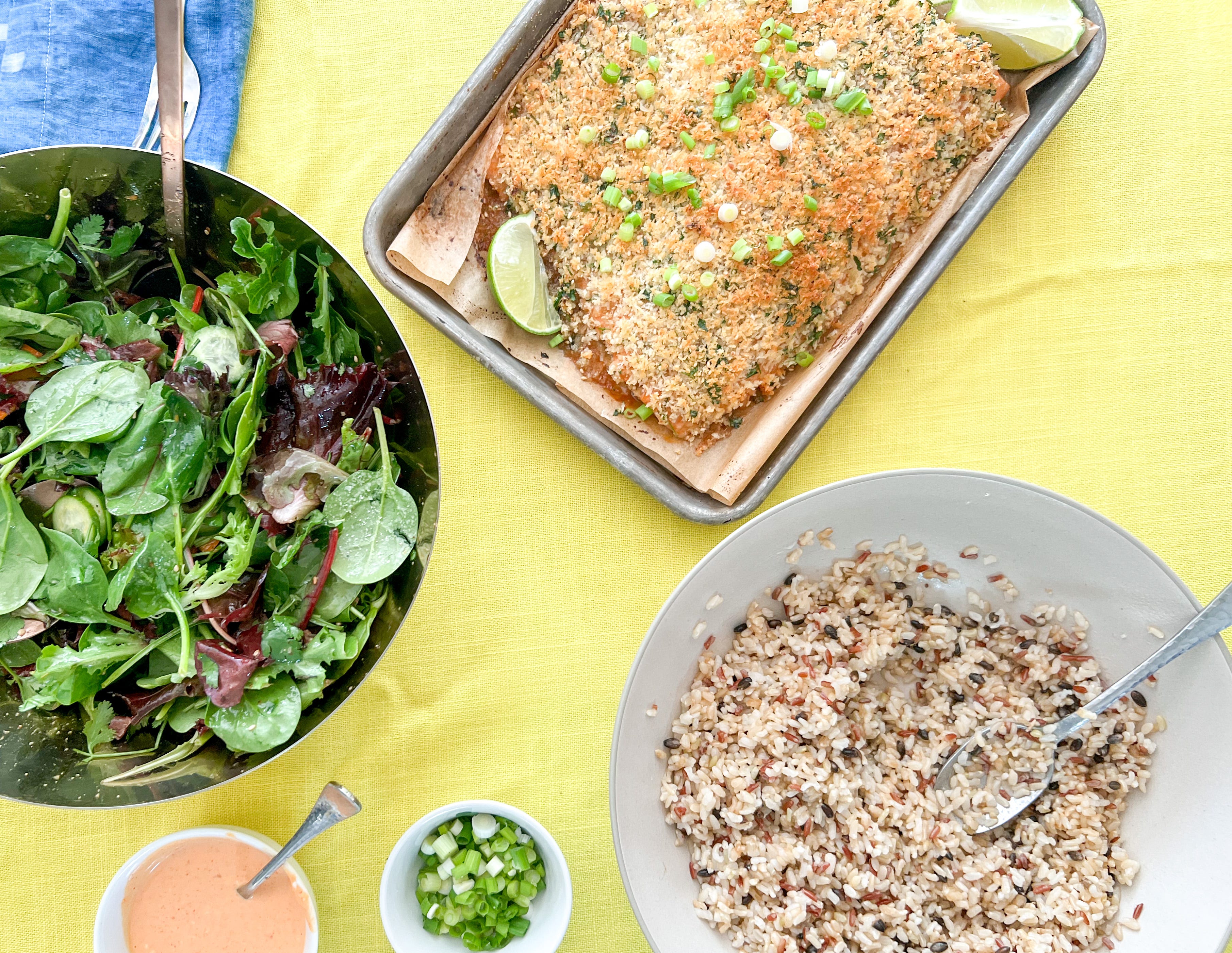 First, our salmon gets seasoned with sriracha and ginger and other delicious flavors, then it’s topped with sesame butter panko and baked. The result is a perfectly flaky and tender spicy, slightly sweet and salty salmon with a golden brown crunchy topping.