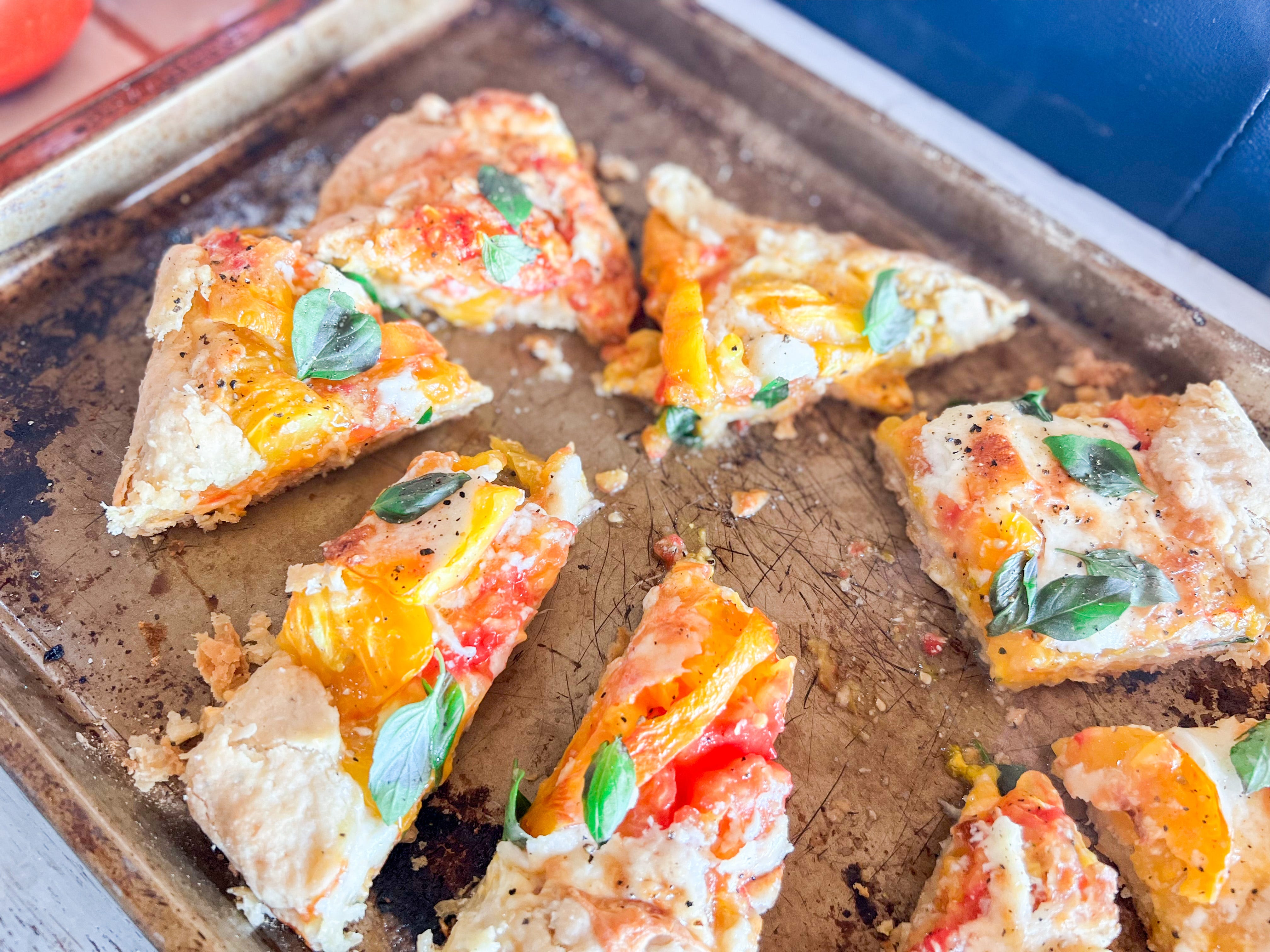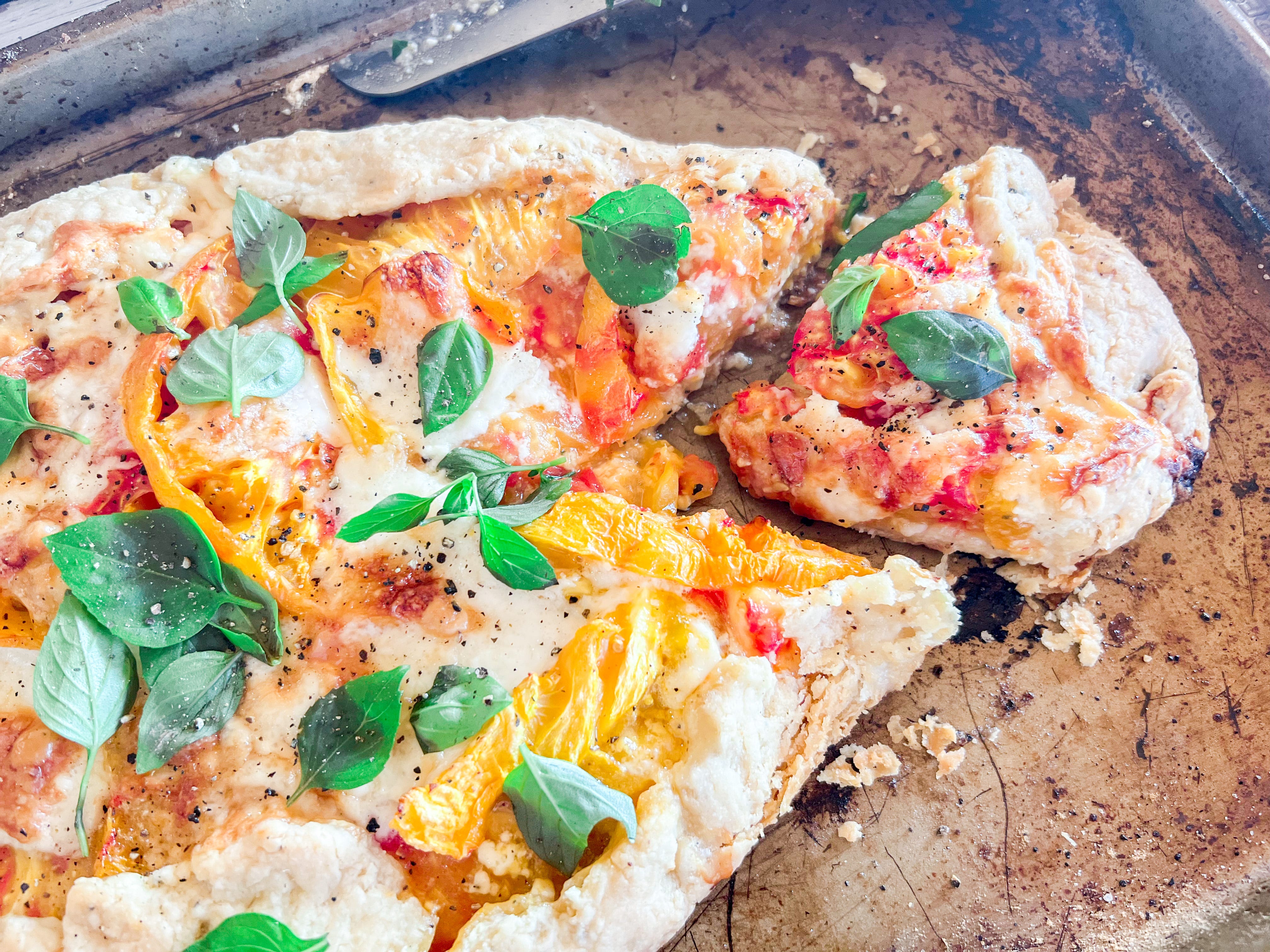 So a few summers ago, faced with our first-ever crop of tomatoes at our then-new home in Carmel Valley, California, I decided to put my spin on tomato pie — making it a galette (aka a rustic, free-form pie, no pie dish required) with beautiful, non-soggy layers of mayo, cheese, and tomatoes, lots of fresh basil, garlic, and my beloved lemon pepper to add a tangy kick.